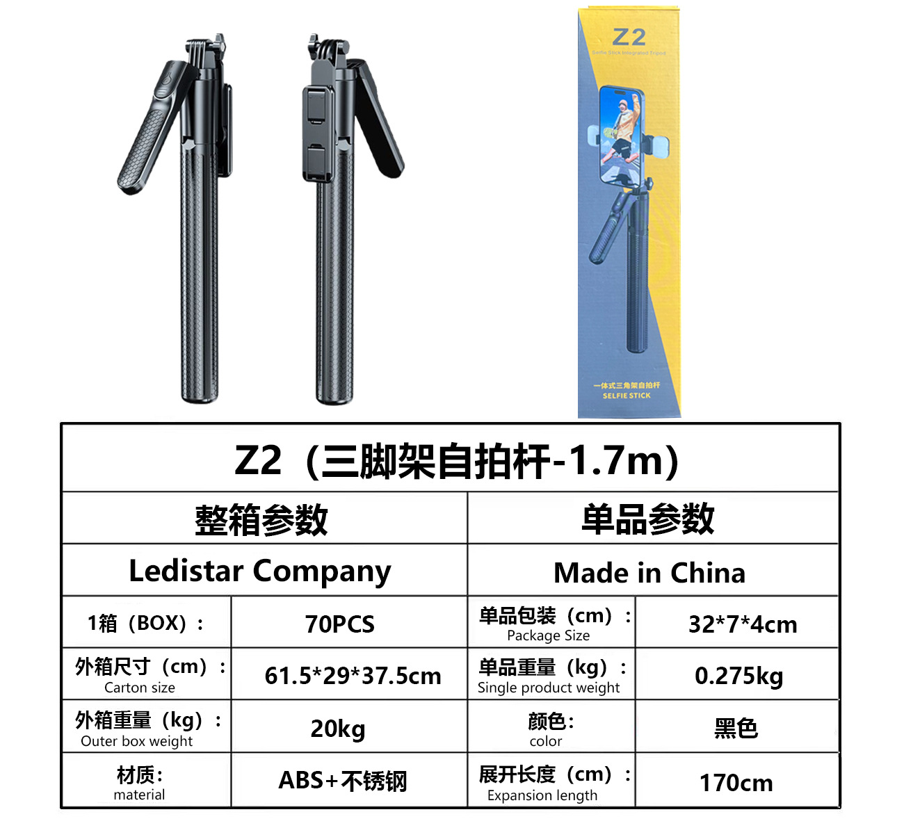 • Z2 싱글 라이트 블랙 [1.7m + 손떨림 방지 핸들 + 블루투스 리모컨 + 삼각대 + 필라이트 1개]