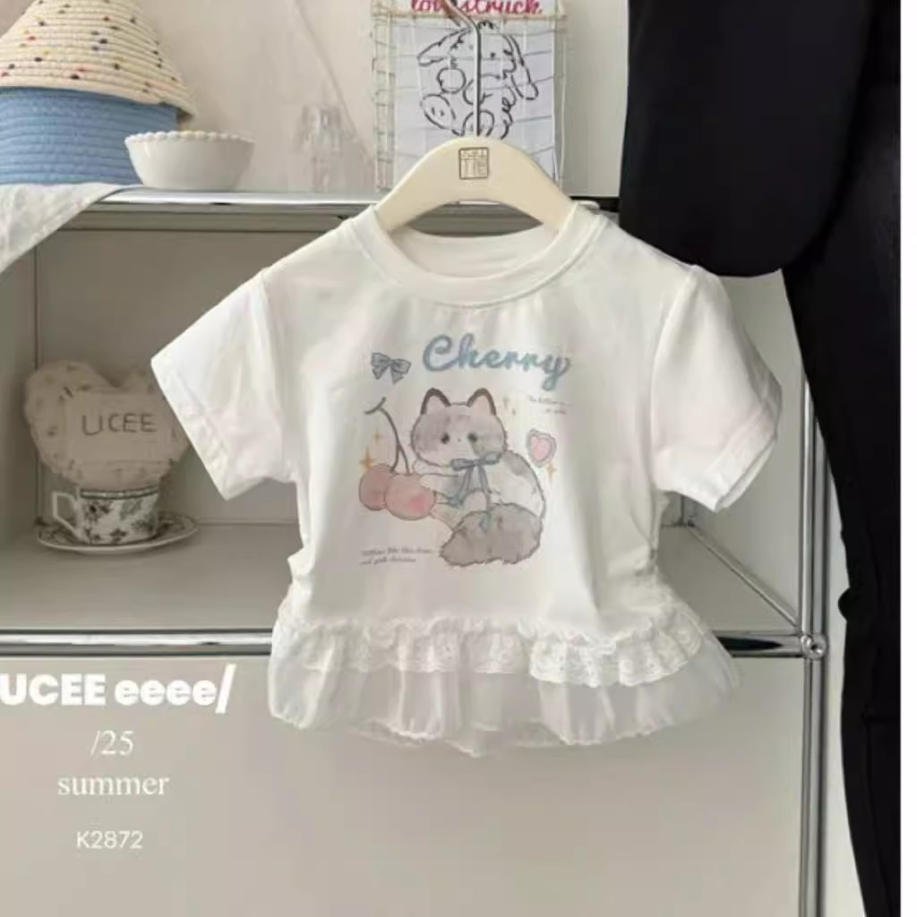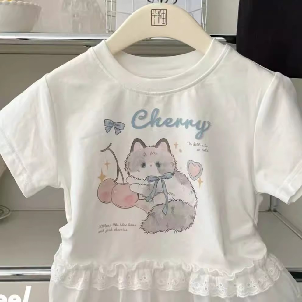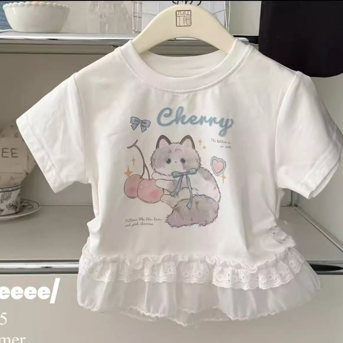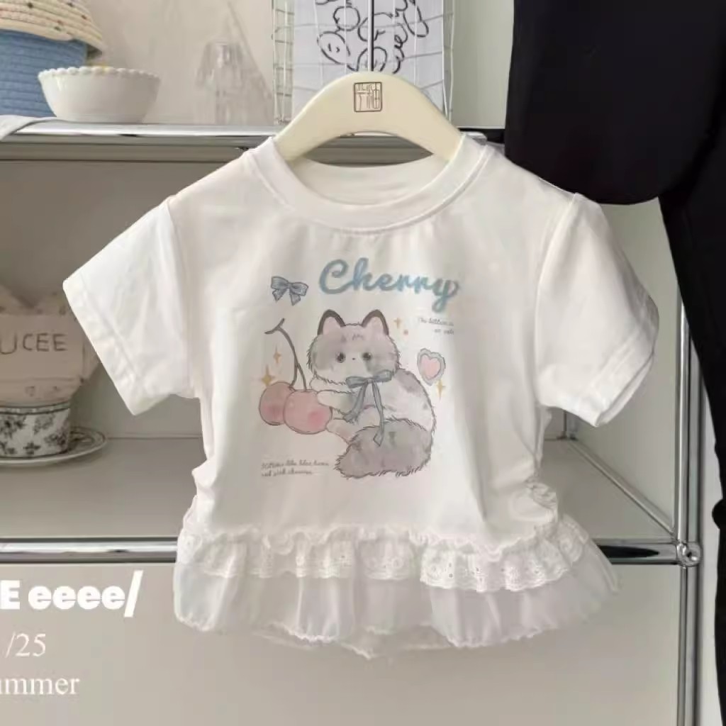 여자 한국 스타일 레이스 반팔 티셔츠 여름 새 아기 귀여운 만화 프린트 고양이 반팔 티셔츠스토어 가기