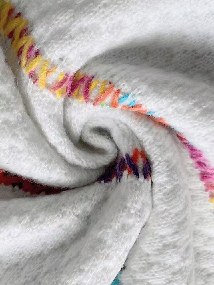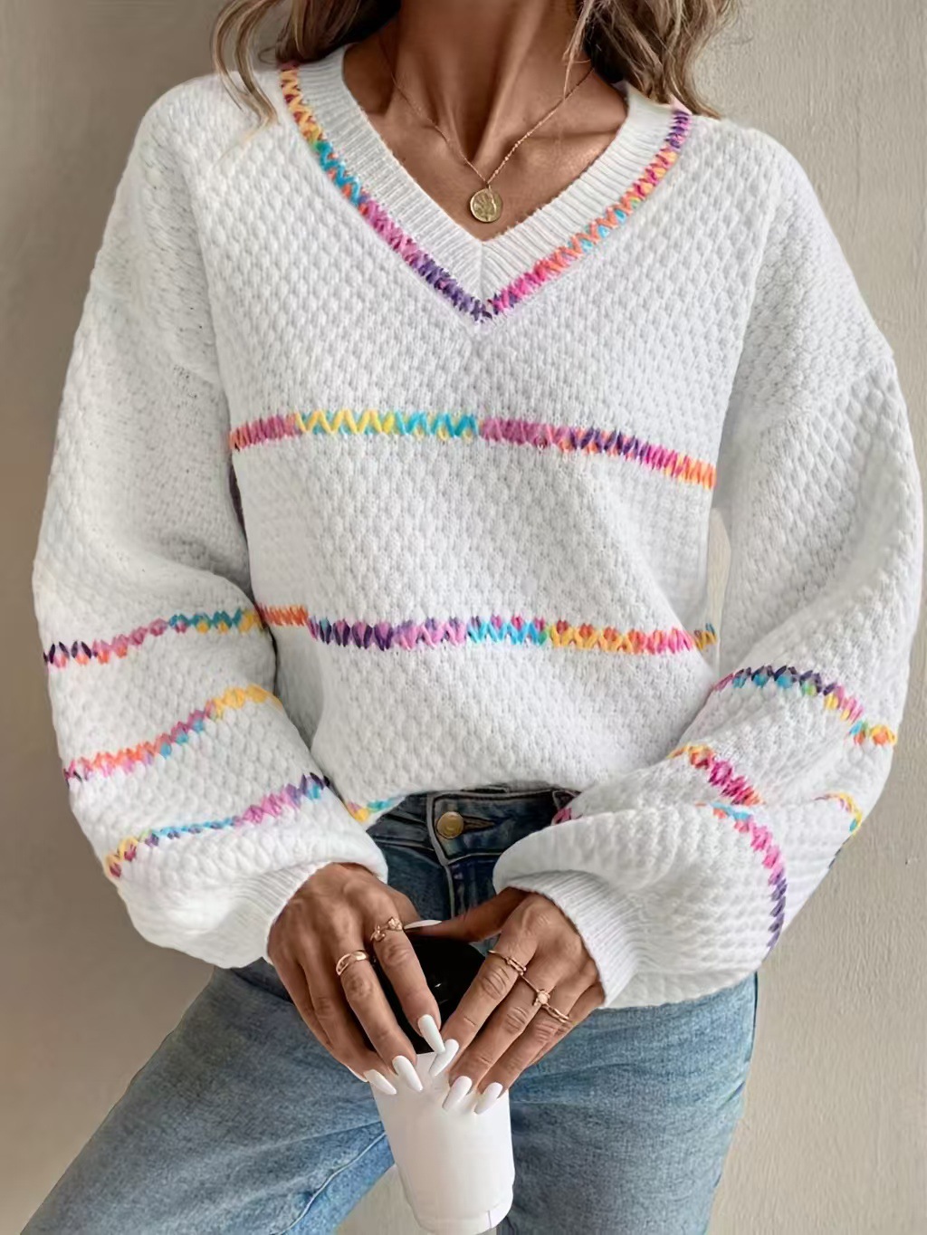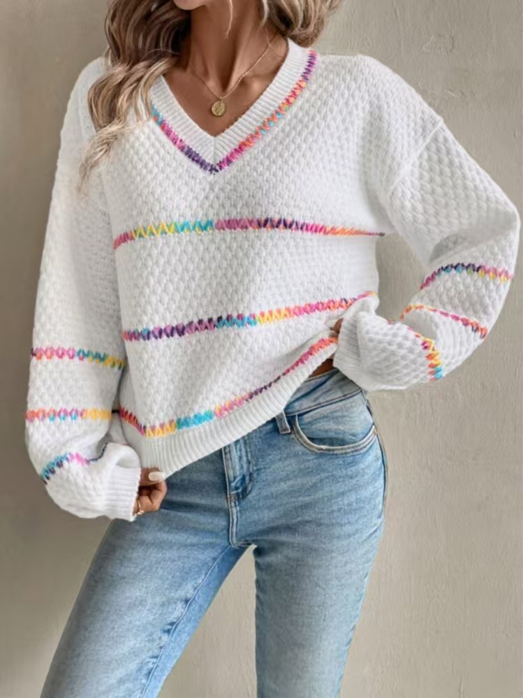 가을 겨울 신작 크로스보더 여성 긴팔 풀오버 루즈한 스웨터 스트라이프 유럽과 미국의 크로스보더 브이넥 대비 화이트 탑