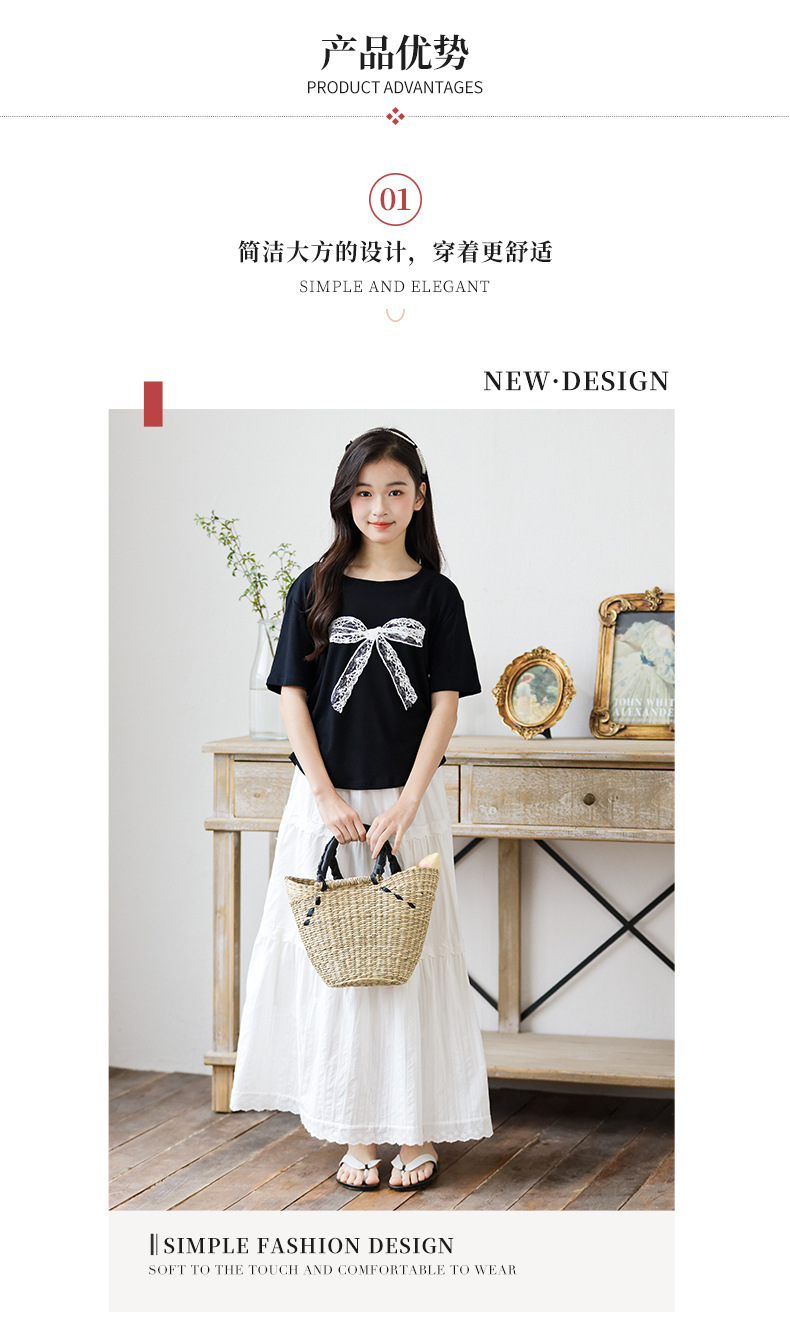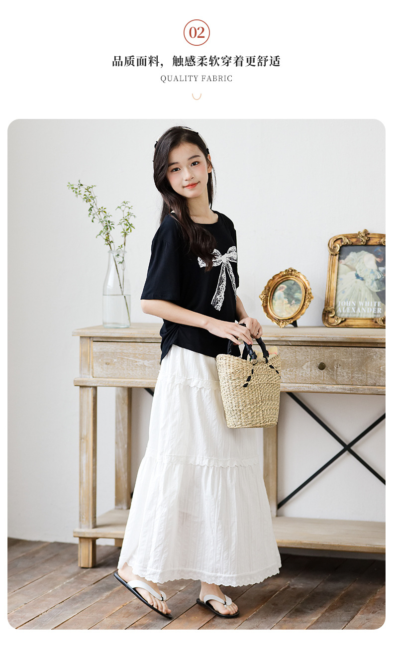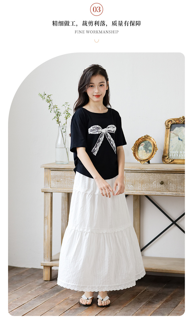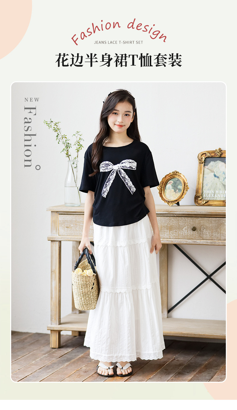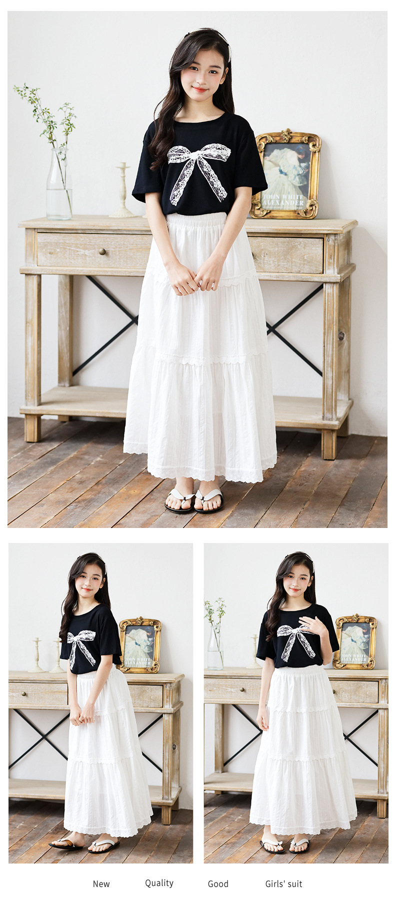 새로운 한국 스타일 여름 스타일 소녀 자카드 코튼 레이스 하프 길이 화이트 케이크 스커트 반팔 티셔츠 소녀 2 피스스토어 가기