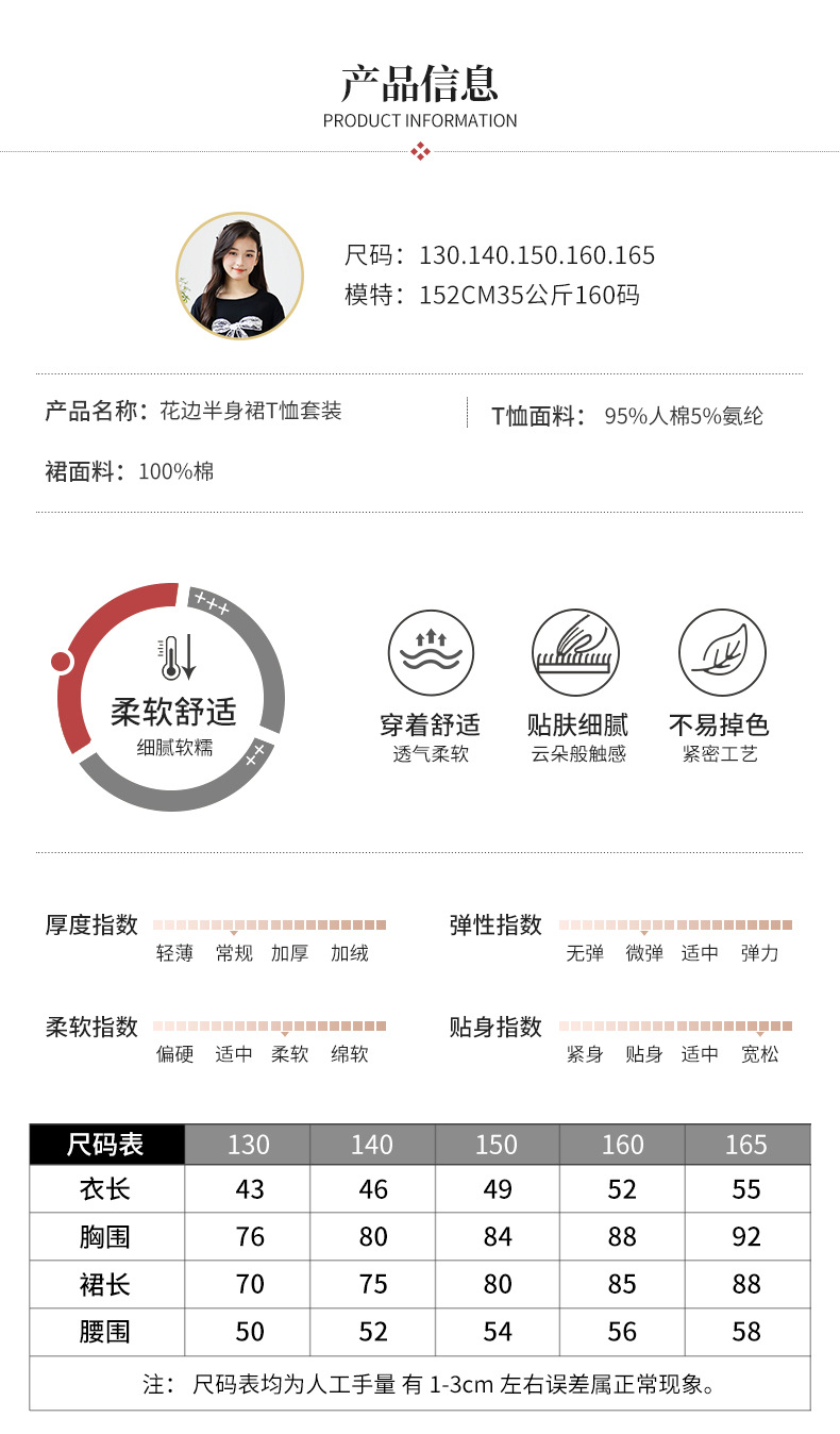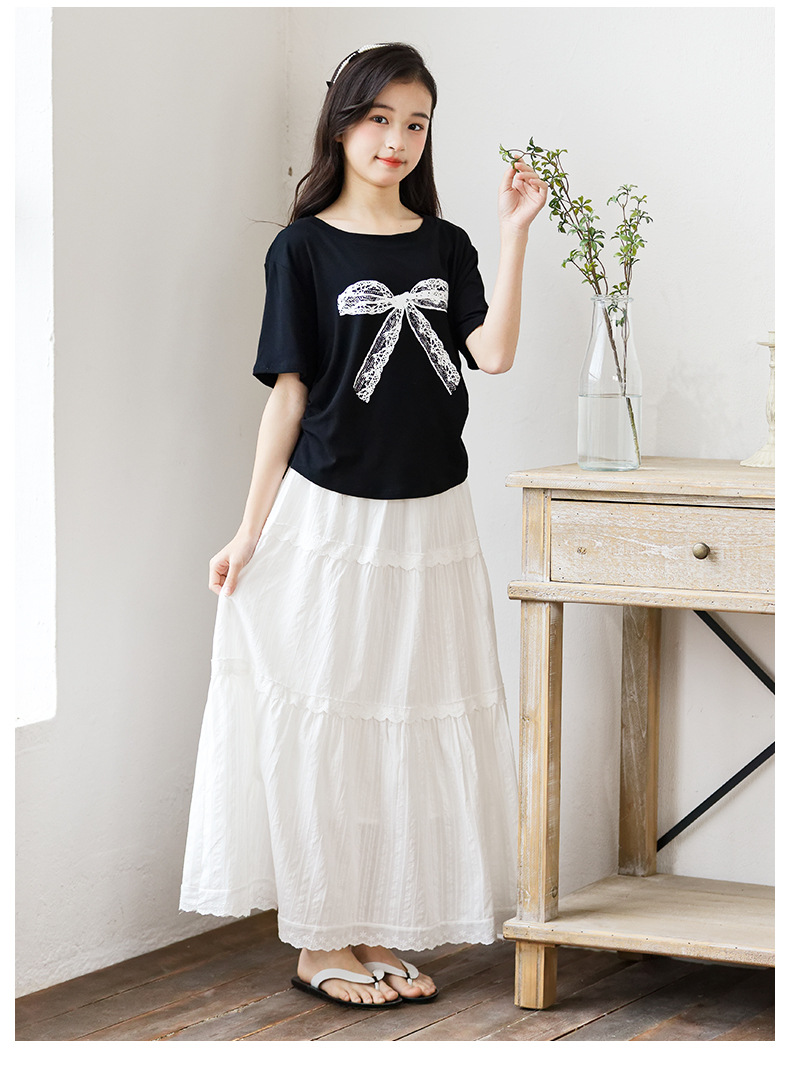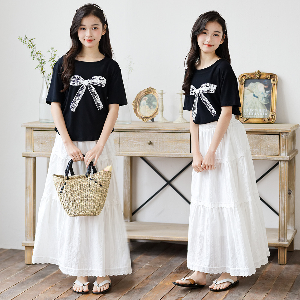 새로운 한국 스타일 여름 스타일 소녀 자카드 코튼 레이스 하프 길이 화이트 케이크 스커트 반팔 티셔츠 소녀 2 피스