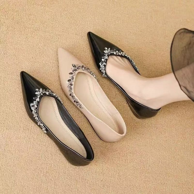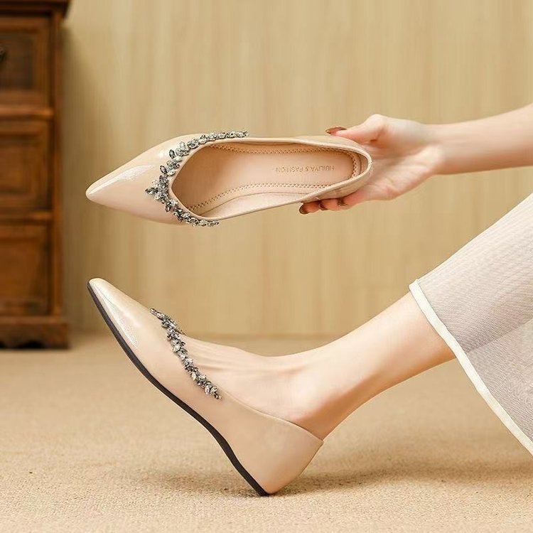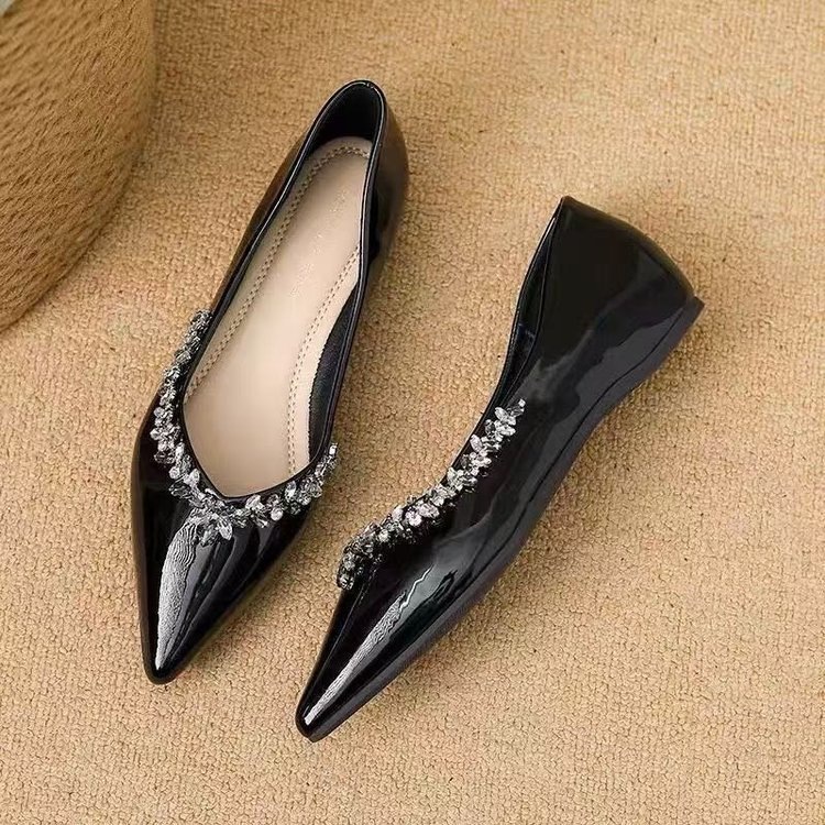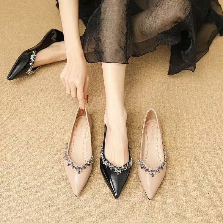 여름 플랫 부드러운 밝은 색상 프렌치 포인티드 로우 힐 2025 여성을위한 새로운 프렌치 스타일 라인 석 특허 가죽 신발스토어 가기