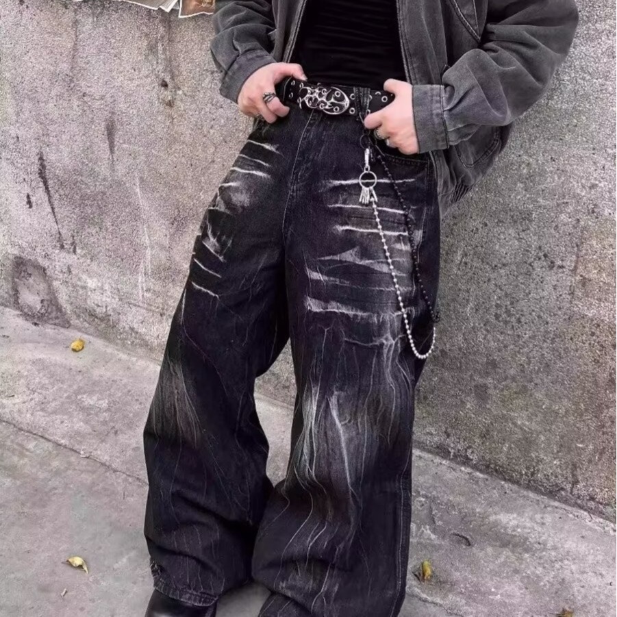 아메리칸 스트리트 트렌디 워싱 스플릿 캣스터드 스트레이트 청바지 남녀공용 트렌디 브랜드 루즈 캐주얼 와이드 레그 데님 팬츠스토어 가기