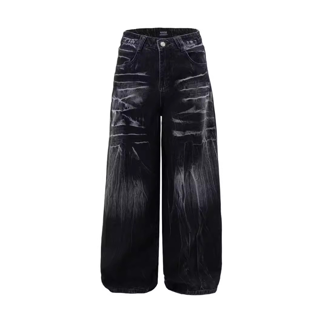 아메리칸 스트리트 트렌디 워싱 스플릿 캣스터드 스트레이트 청바지 남녀공용 트렌디 브랜드 루즈 캐주얼 와이드 레그 데님 팬츠