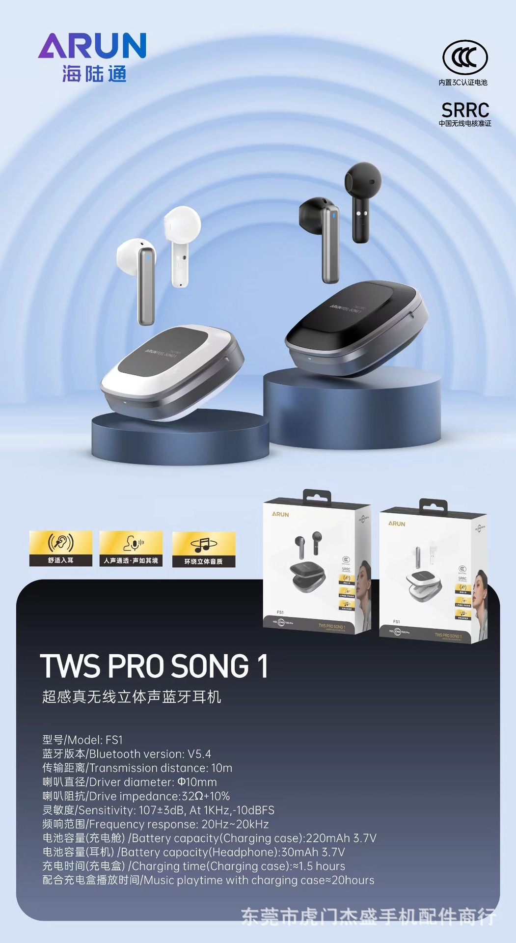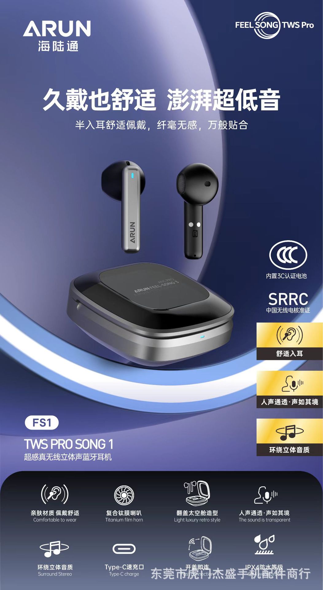 新款蓝牙耳机FS1,舒适半入耳无感佩戴,复合钛膜喇叭环绕立体音质。