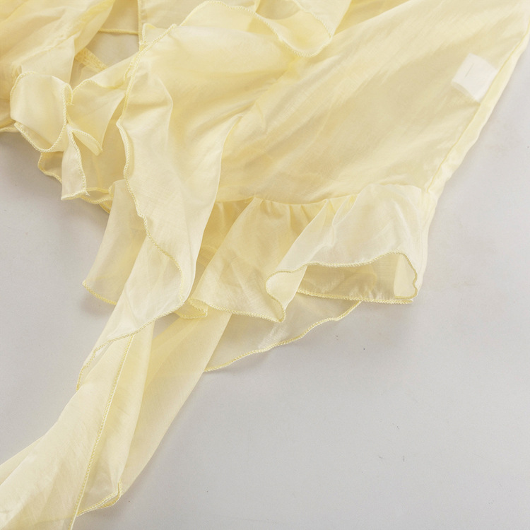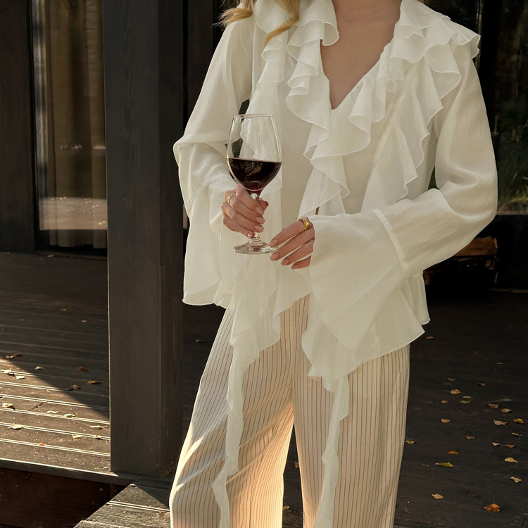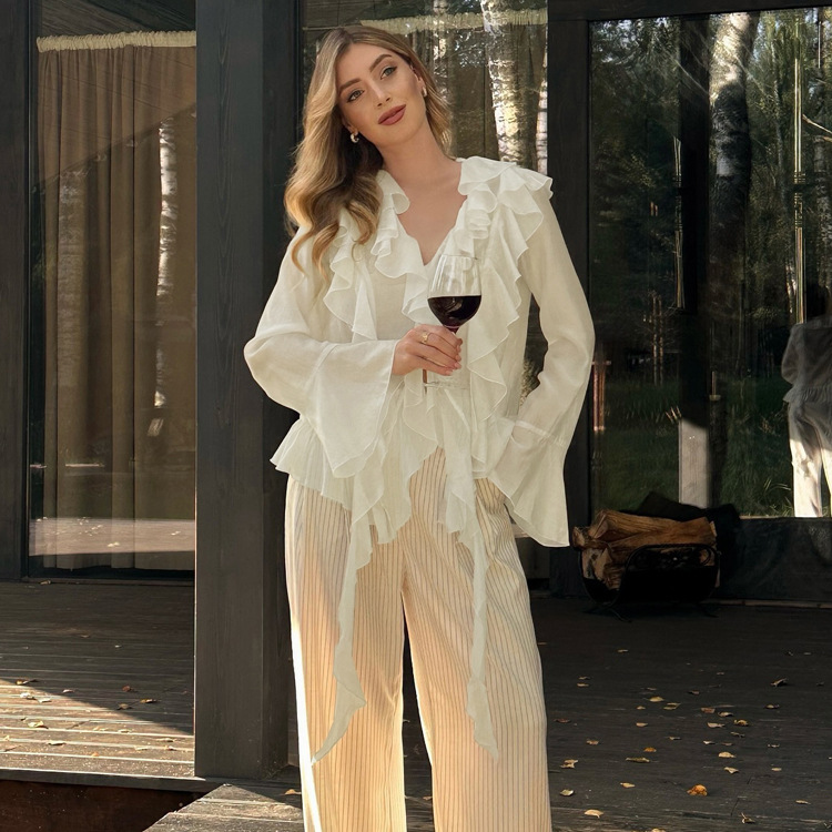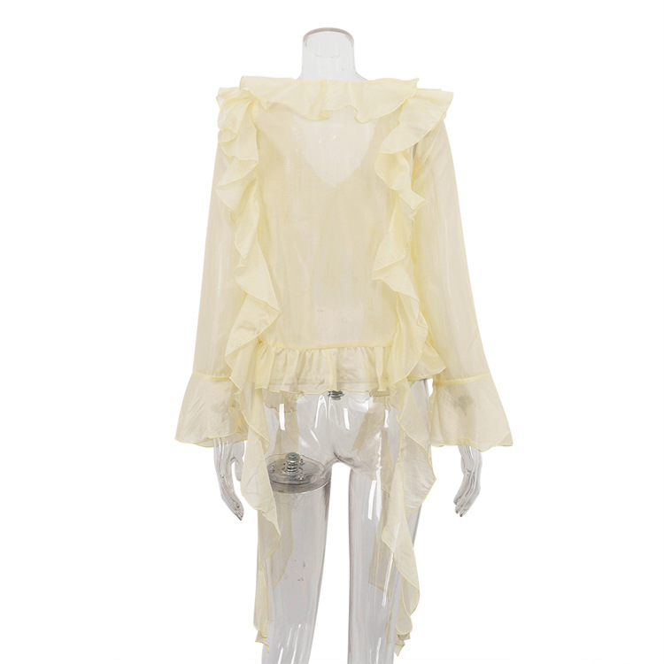 국경 간 패션 여성 의류 프릴 태양 보호 긴 소매 프렌치 셔츠 여름 새로운 캐주얼 디자인 쉬폰 탑