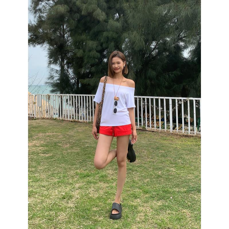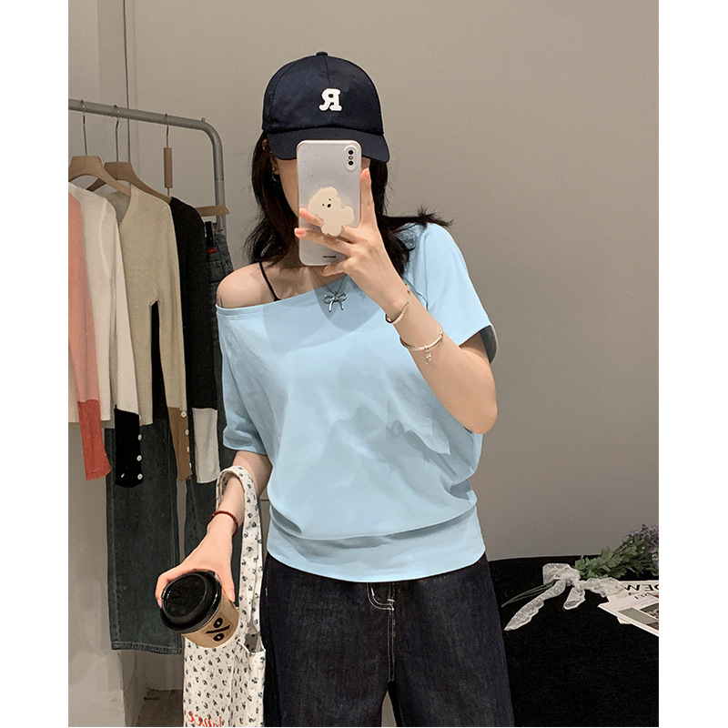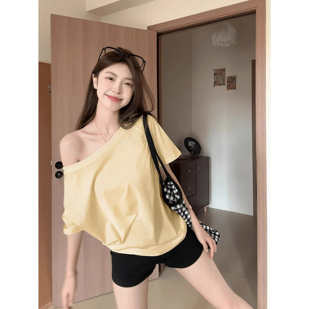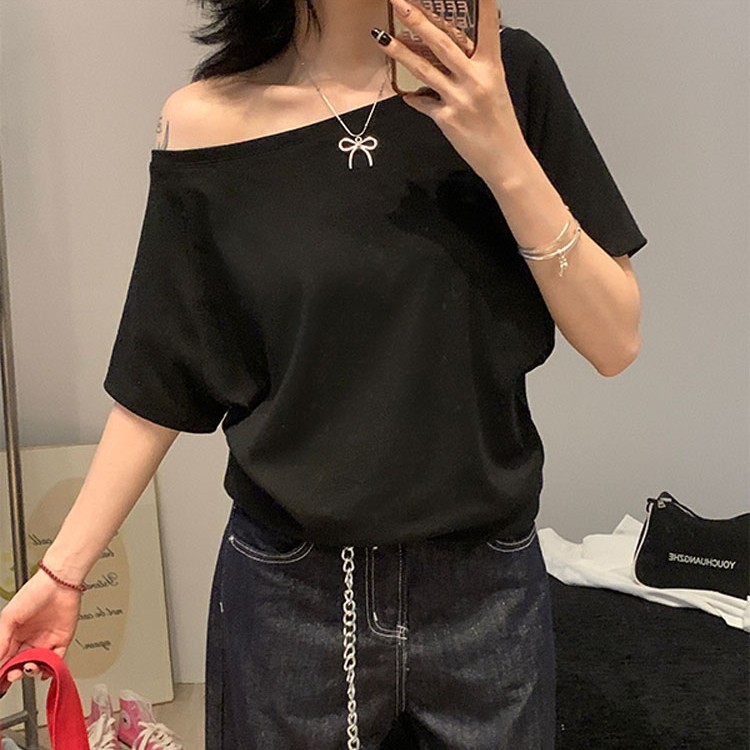여름 여성을 위한 화이트 슬로프 숄더 다용도 반팔 티셔츠, 루즈한 배 커버, 게으른 스타일, 등이 없는 섹시한 탑스토어 가기