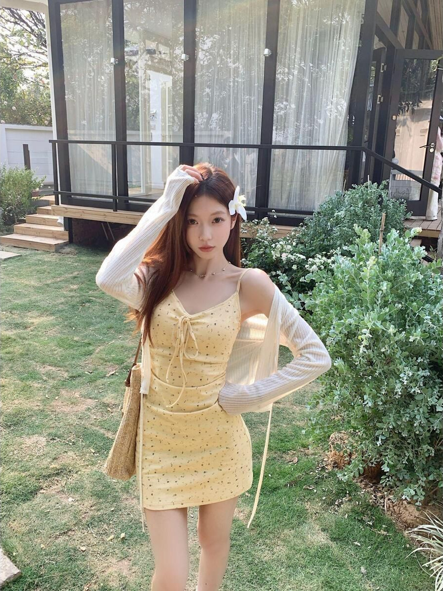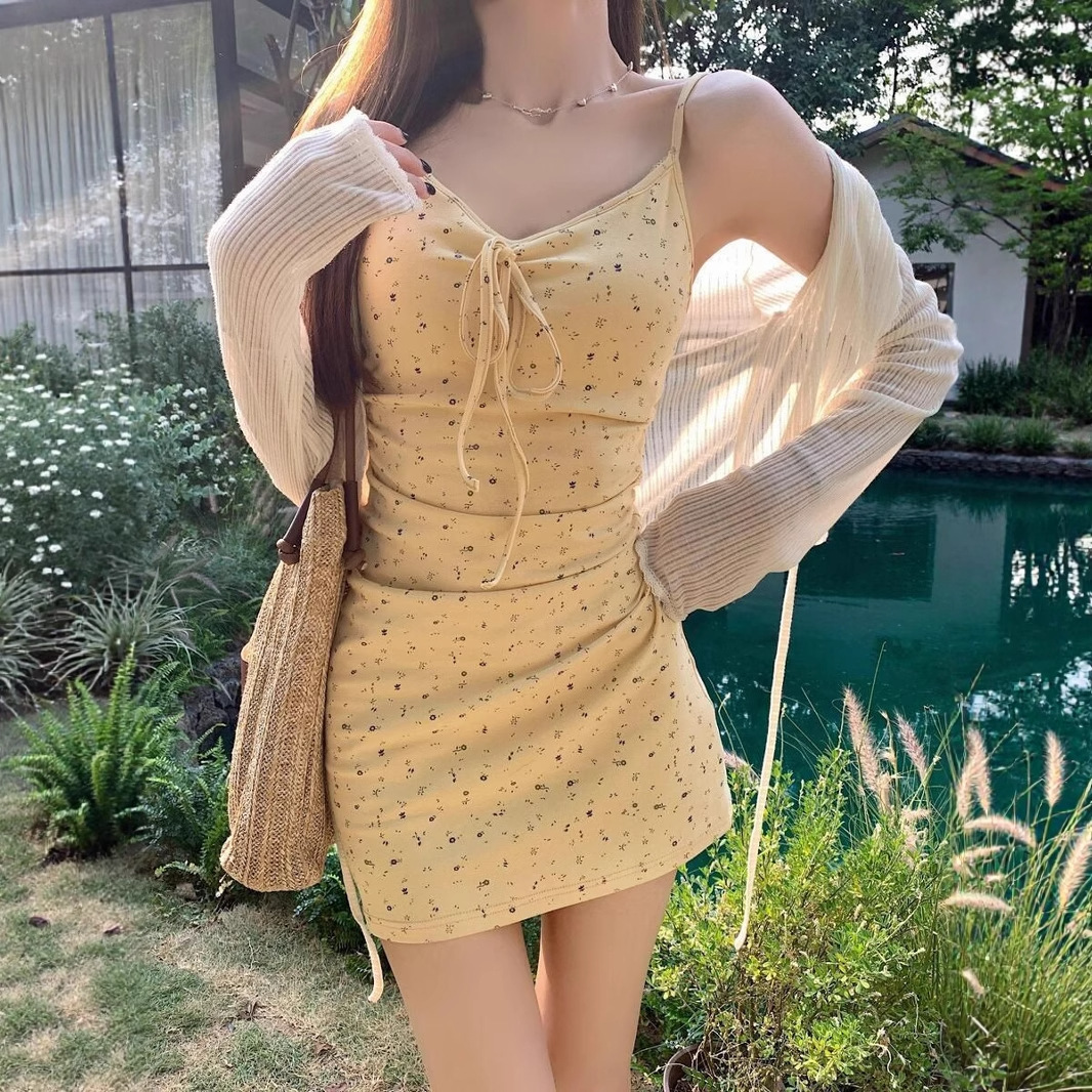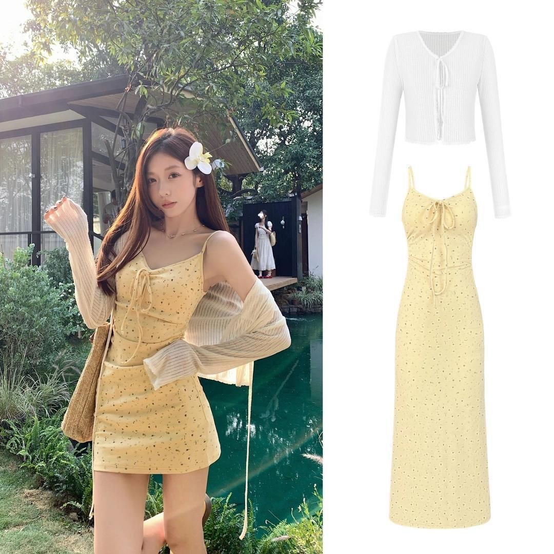 여성을위한 부드러운 노란색 꽃 무늬 서스펜더 드레스 정장 여름 긴팔 자외선 차단 셔츠 허리 꽃 무늬 스커트 투피스 세트