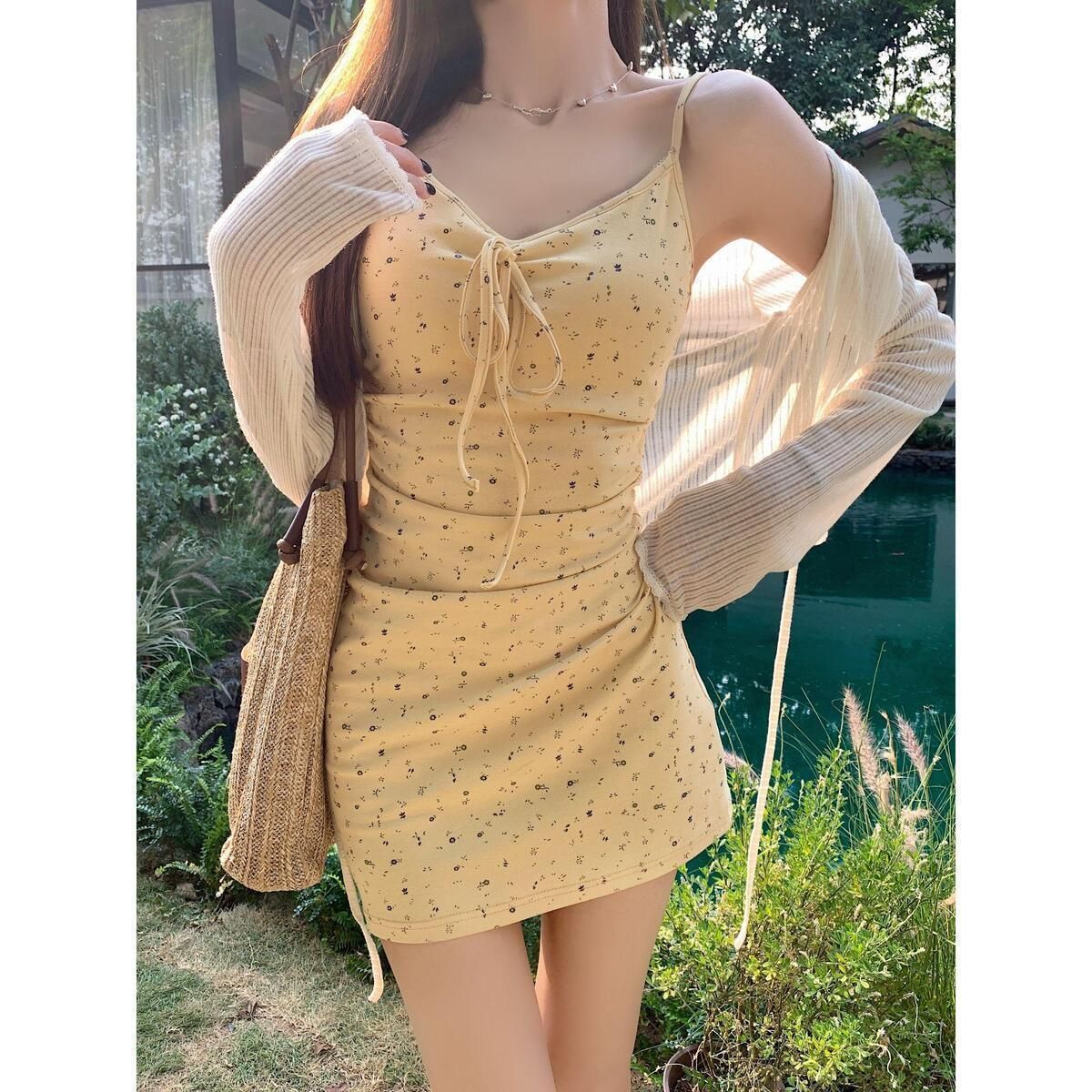 여성을위한 부드러운 노란색 꽃 무늬 서스펜더 드레스 정장 여름 긴팔 자외선 차단 셔츠 허리 꽃 무늬 스커트 투피스 세트스토어 가기