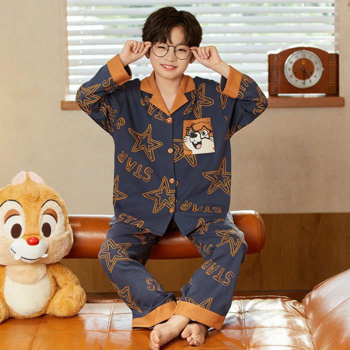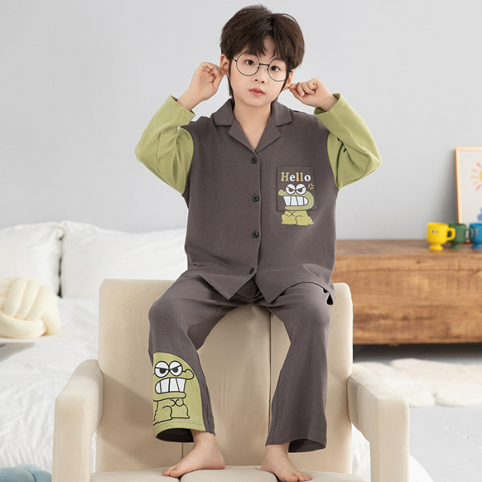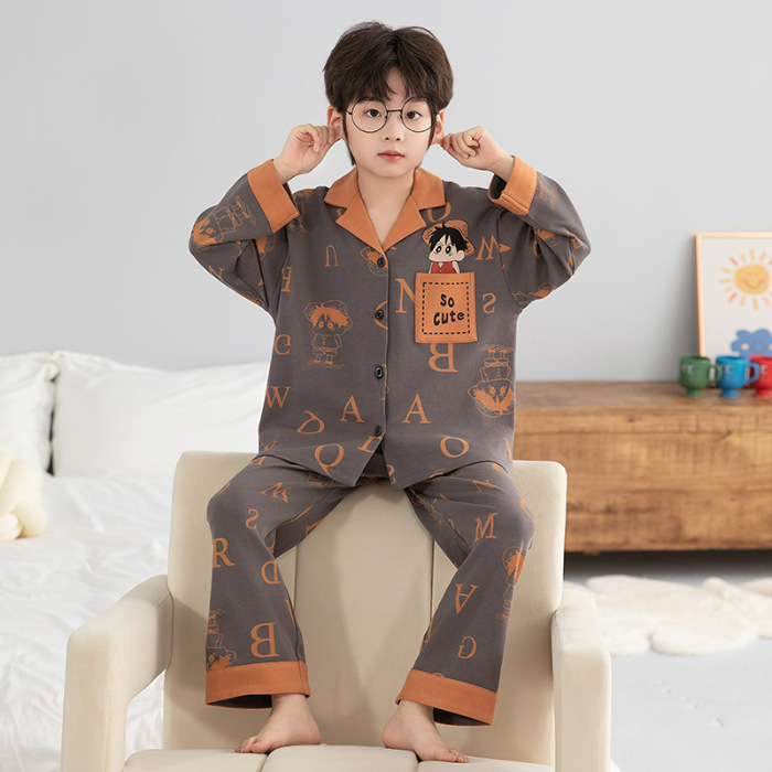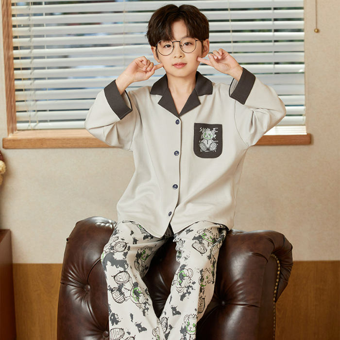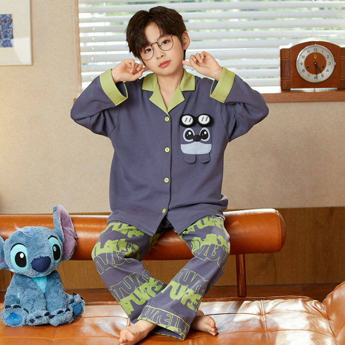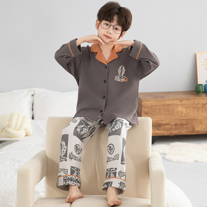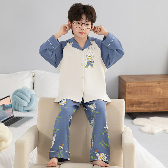 소년 아동 잠옷 봄, 가을 순면 만화 캐릭터 카라 가디건 긴팔 중학생용 얇은 스타일 중대형 아동 홈웨어