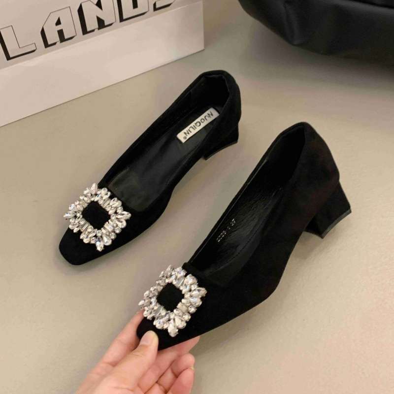 발이 피곤하지 않은 여성을 위한 프렌치 스퀘어토 하이힐, 2025년 새로운 한국 스타일의 여성 통근용 라인스톤 스퀘어힐 슈즈스토어 가기