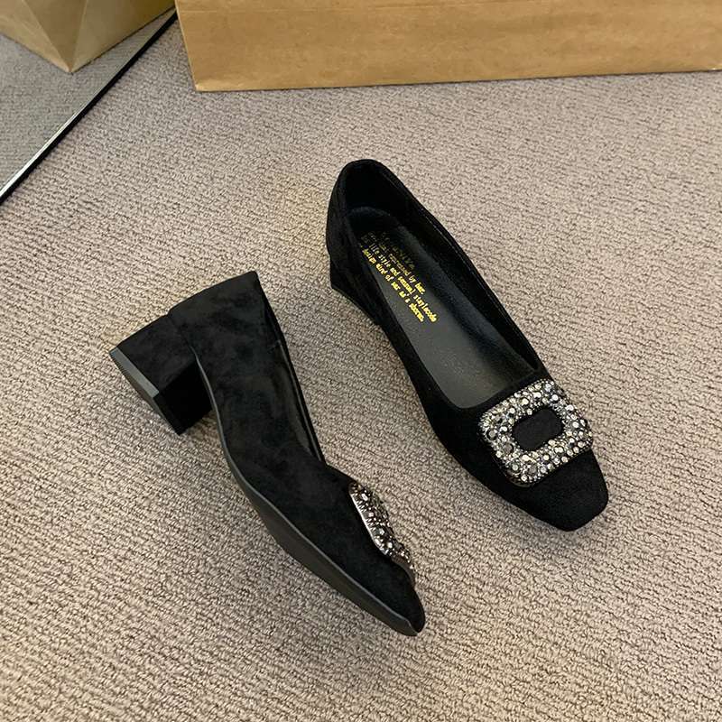 발이 피곤하지 않은 여성을 위한 프렌치 스퀘어토 하이힐, 2025년 새로운 한국 스타일의 여성 통근용 라인스톤 스퀘어힐 슈즈