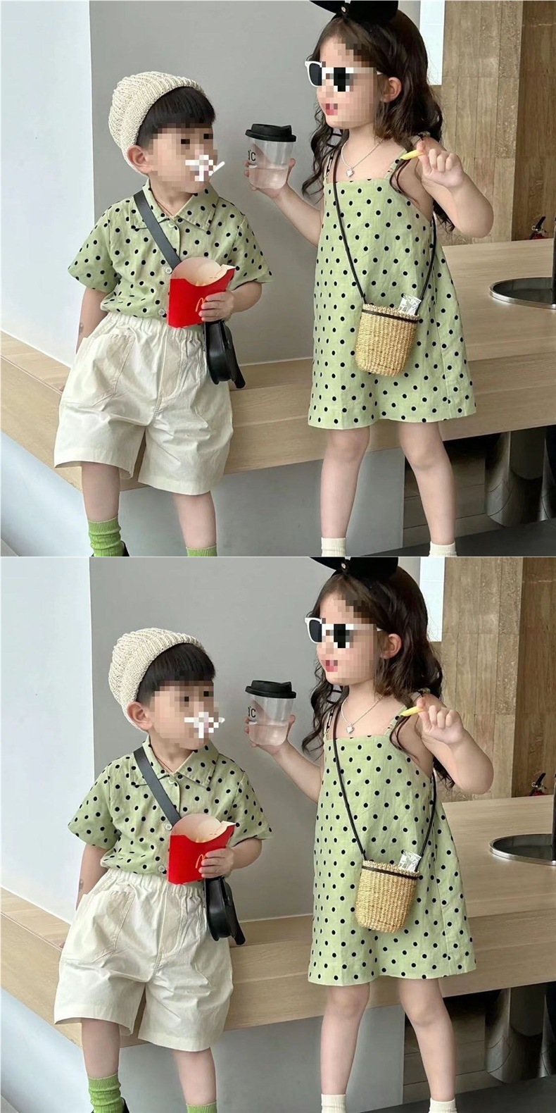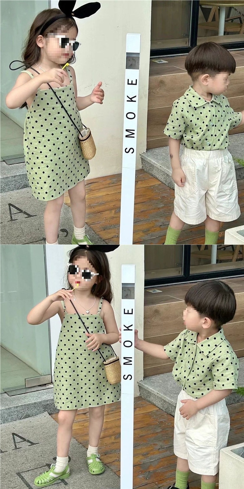 한국 형제 자매 복장 2024 여름 소녀 녹색 폴카 도트 서스펜더 스커트 아기 소년 폴카 도트 셔츠 캐주얼 바지 정장스토어 가기