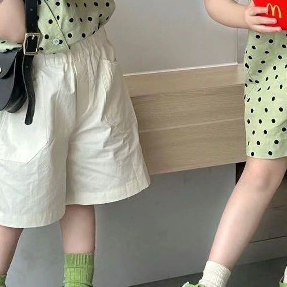 한국 형제 자매 복장 2024 여름 소녀 녹색 폴카 도트 서스펜더 스커트 아기 소년 폴카 도트 셔츠 캐주얼 바지 정장