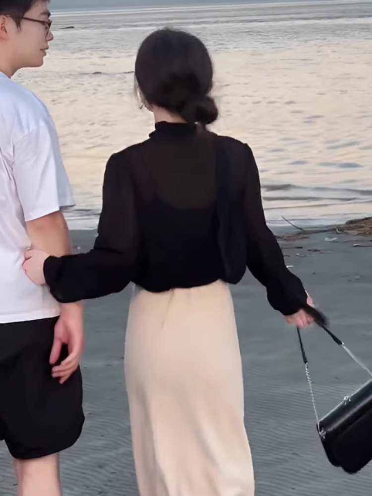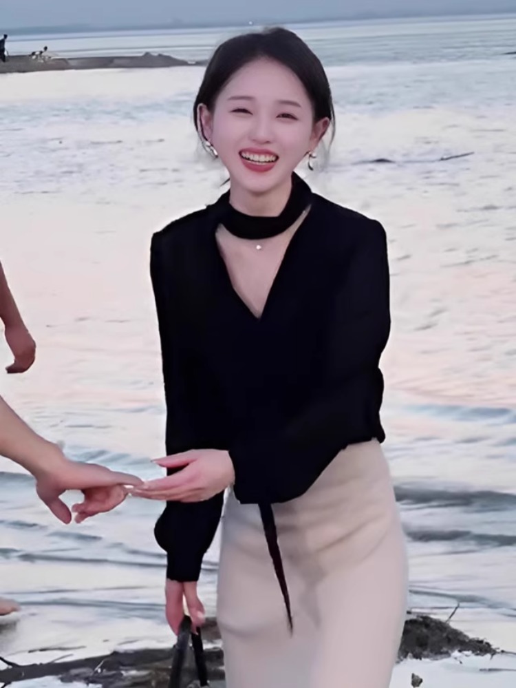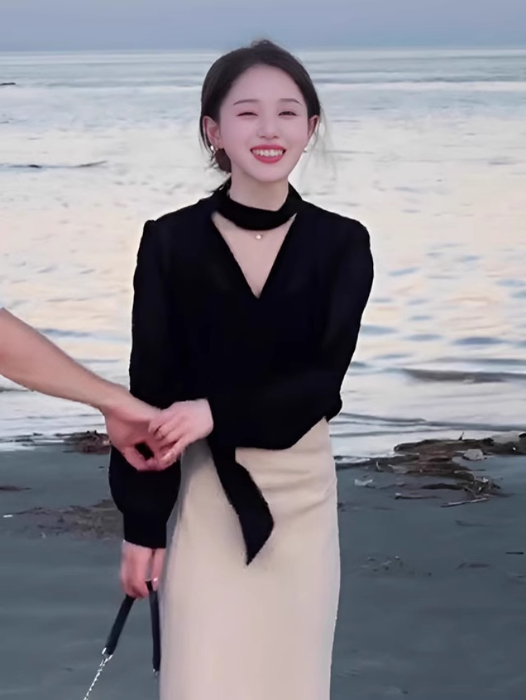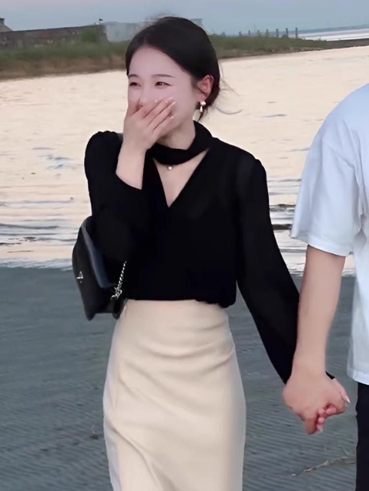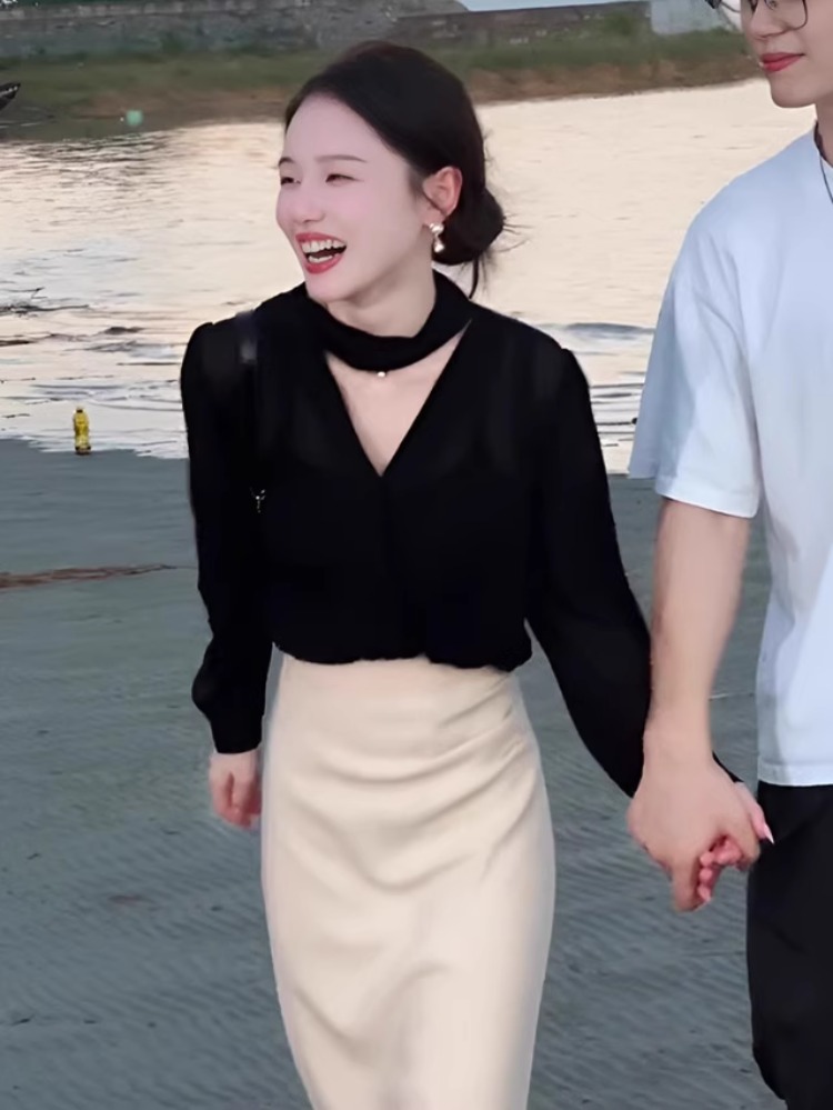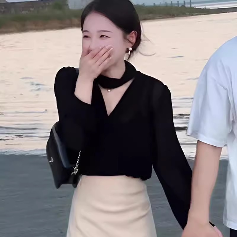 여름 여성을 위한 프렌치 라이트 럭셔리 하이엔드 블랙 긴팔 셔츠 새로운 스타일 루즈한 기질 홀터넥 리본 쉬폰 탑스토어 가기