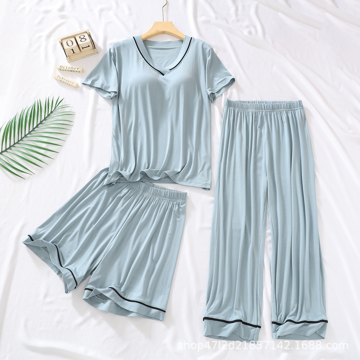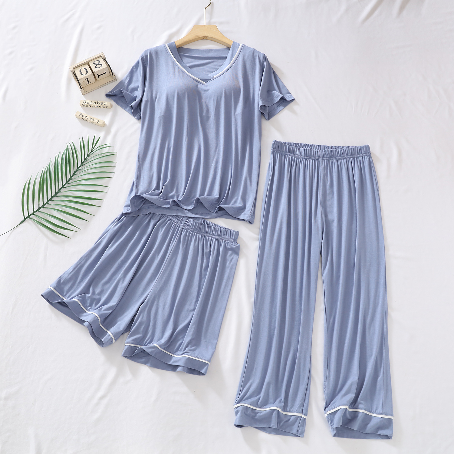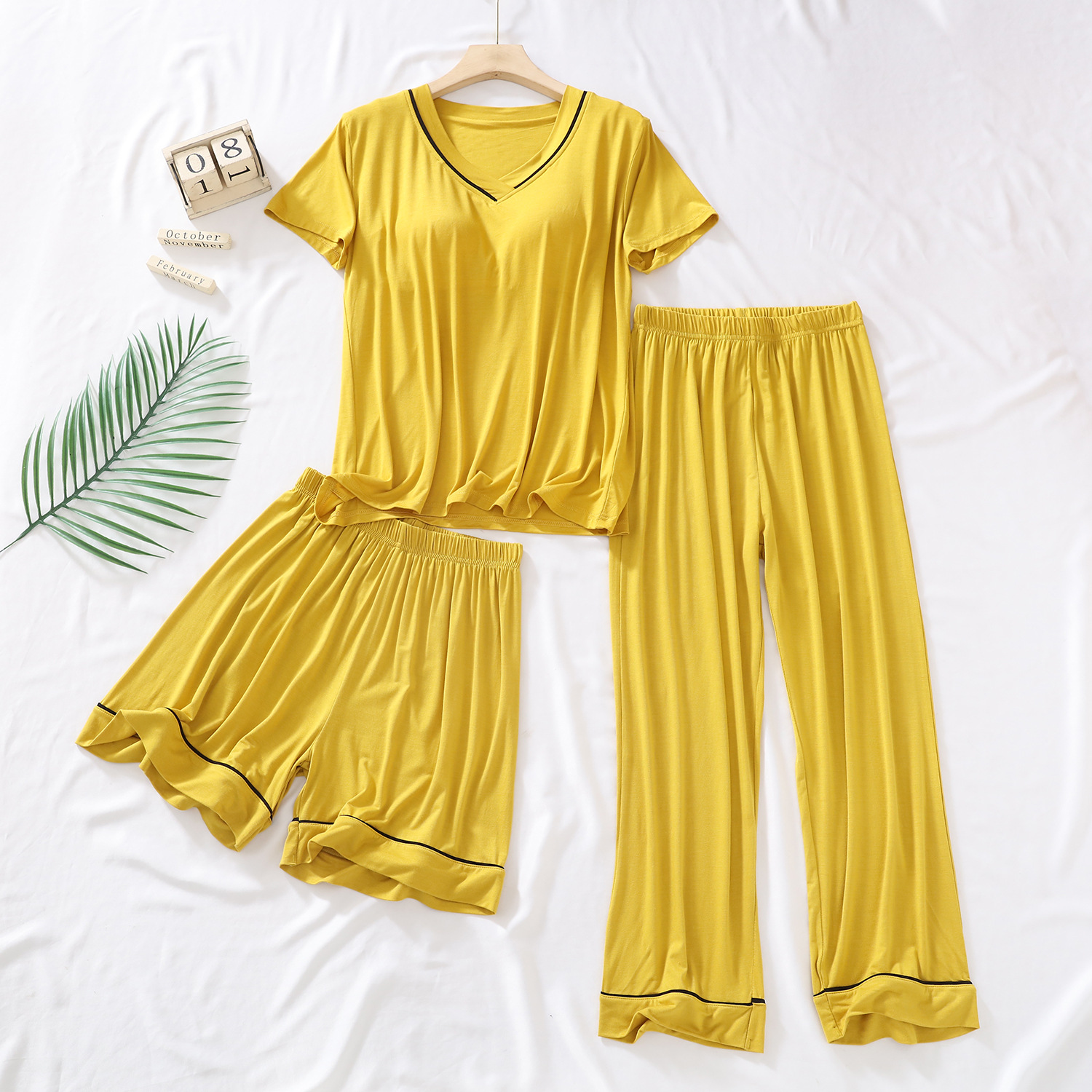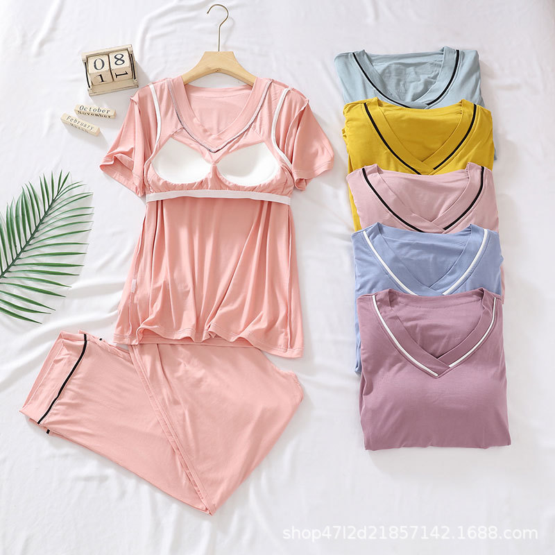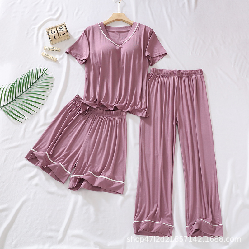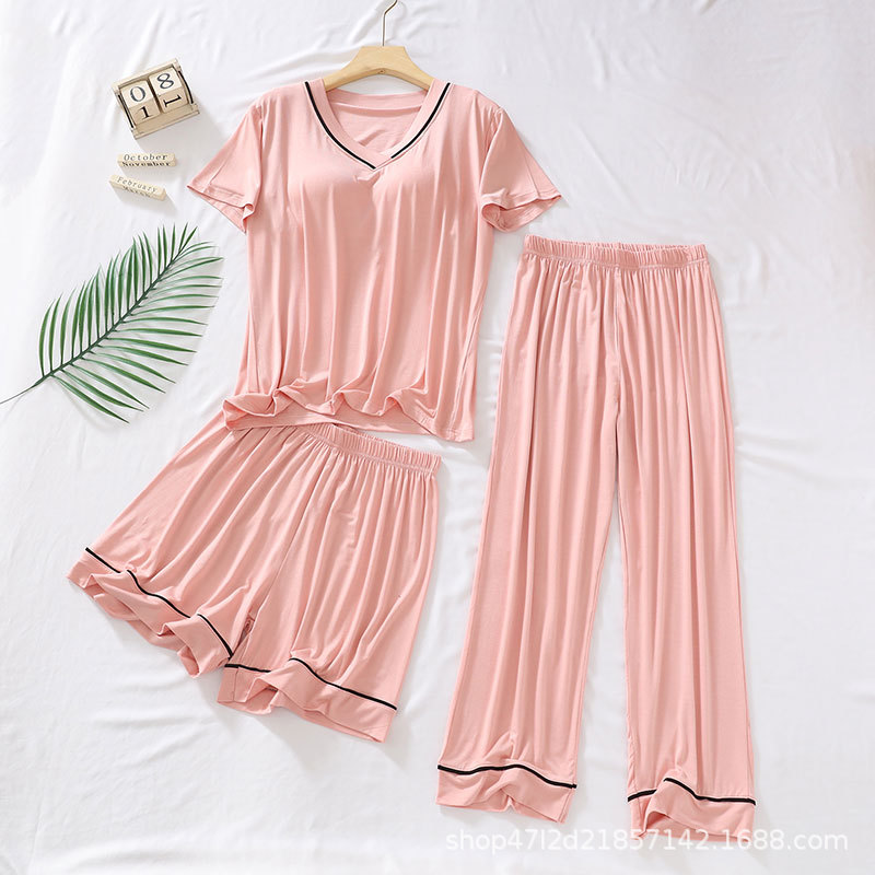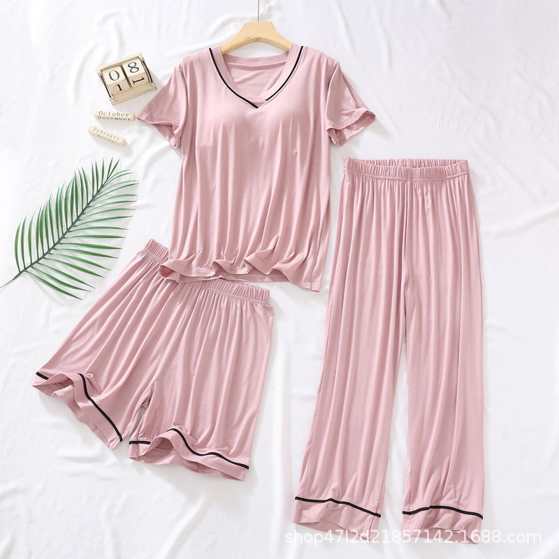 여성용 모달 패딩 잠옷 2025년 신상 여름 얇은 루즈핏 반팔 7부 바지 3피스 홈웨어 세트스토어 가기