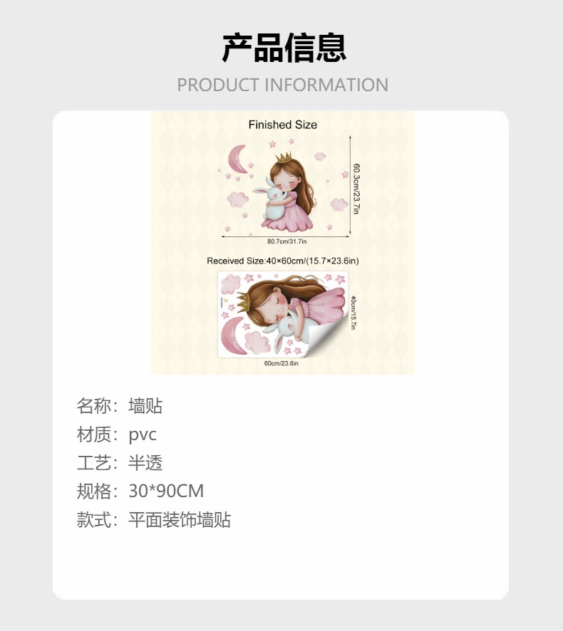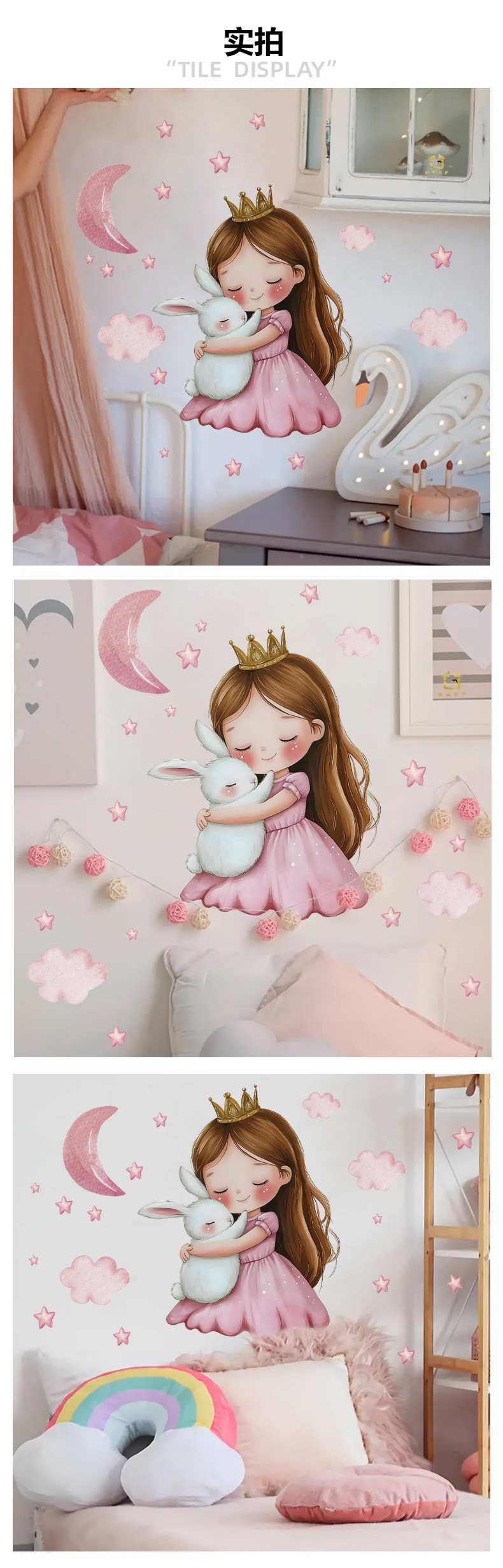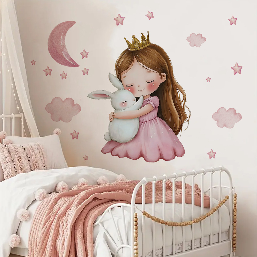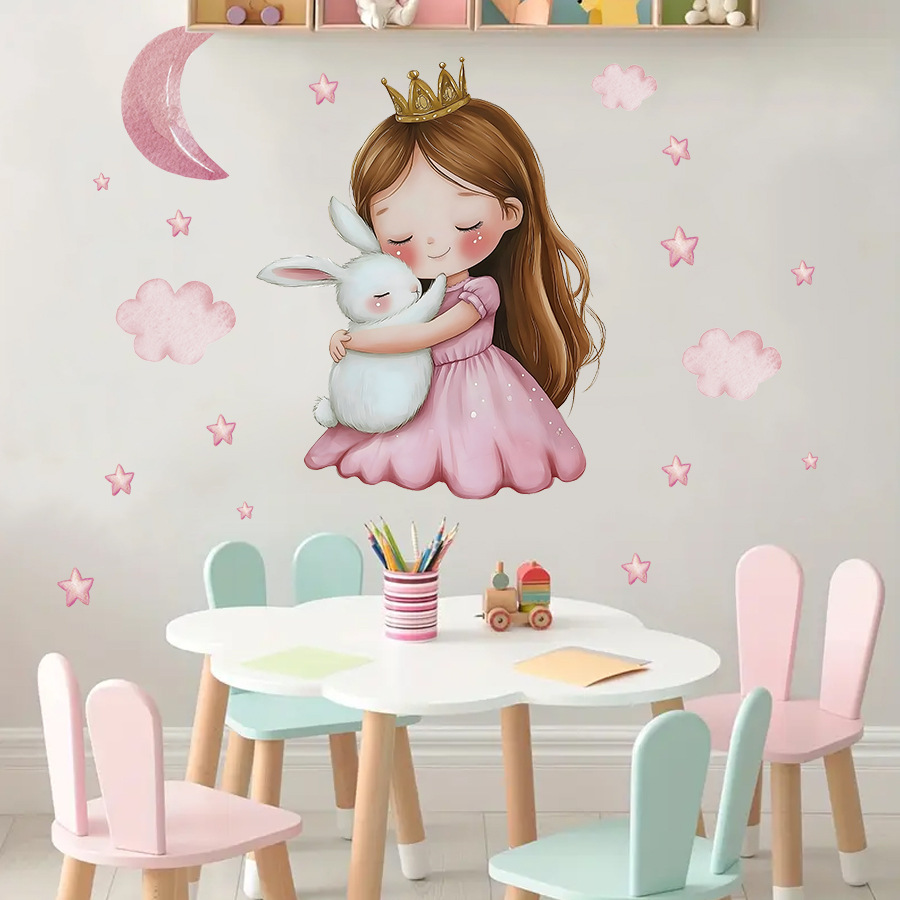 HS1255H 귀여운 소녀 작은 공주 토끼 별이 빛나는 하늘 자가 접착 벽 스티커 핑크색 따뜻한 어린이 방 장식 스티커스토어 가기