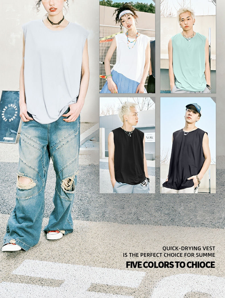 남성용 아이스 실크 여름 속건 반팔 한국 스타일 편안한 스포츠 캐주얼 조끼 여름 루즈핏 통기성 트렌디 민소매