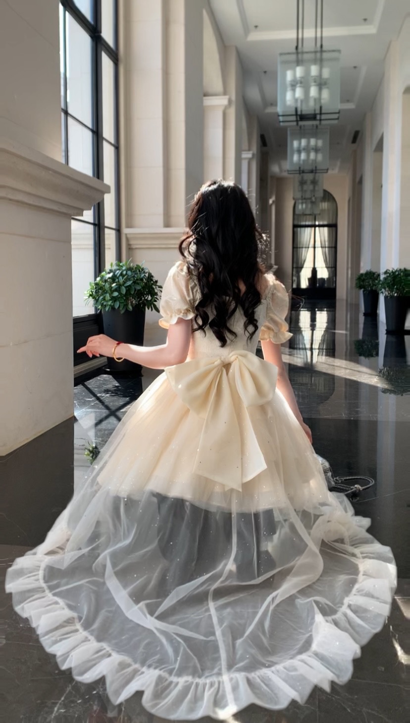 블로벨란 반쪽 하트 대형 리본 공주 드레스 자카드 퍼프 스팽글 트레인 드레스 생일 드레스 트렌디