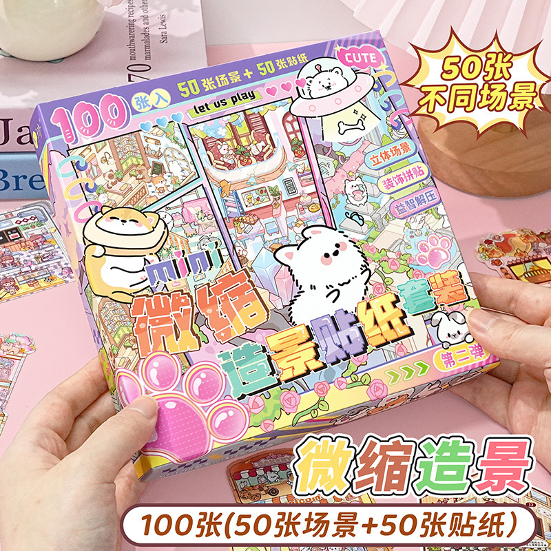 미니어처 조경 스티커 세트 50 장면 스티커 핀셋 세트 어린이 절단없는 조경 스티커 컬렉션 도서스토어 가기