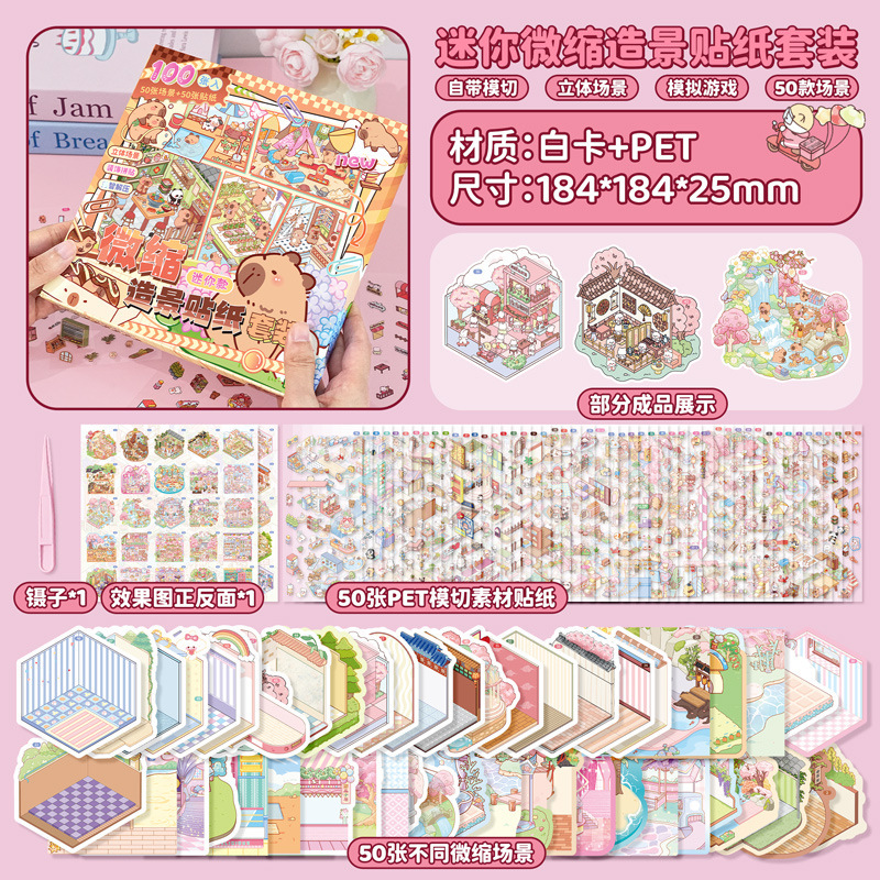 미니어처 조경 스티커 세트 50 장면 스티커 핀셋 세트 어린이 절단없는 조경 스티커 컬렉션 도서