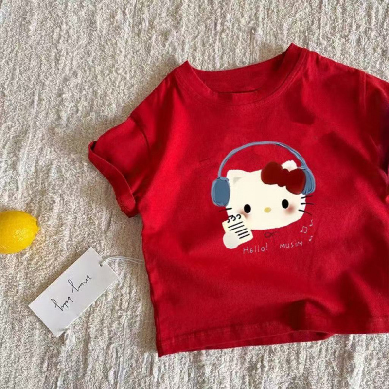 순수 코튼 어린이 여름 반팔 티셔츠 소년과 소녀를위한 새로운 스타일 라운드 넥 만화 반팔 탑 아기 KT 고양이 셔츠스토어 가기