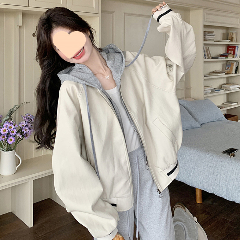여성을위한 미색 가짜 투피스 후드 자켓 2025 봄 새로운 한국 대학 스타일 캐주얼 패션 짧은 자켓스토어 가기