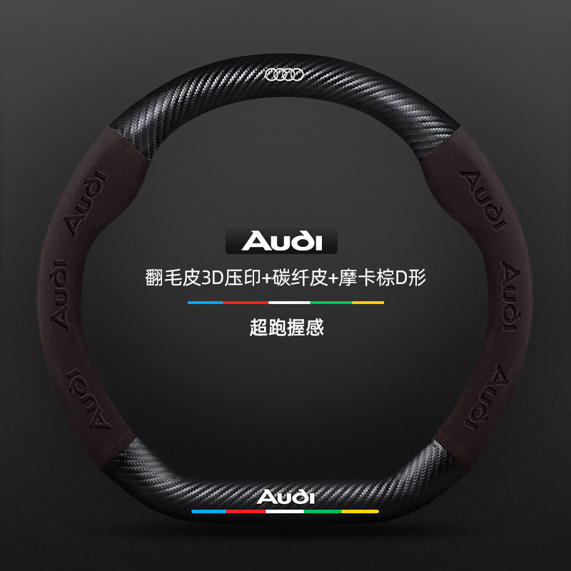• 스웨이드 3D 엠보싱 탄소 섬유 가죽 모카 브라운 D자형 아우디 로고