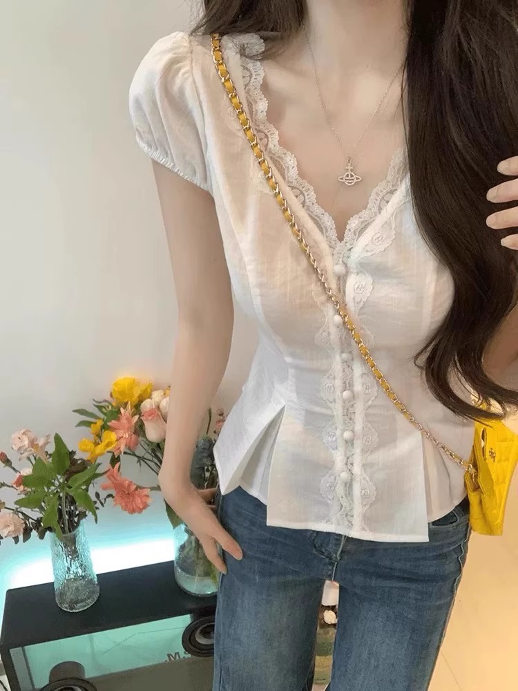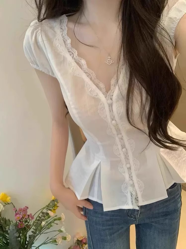 프렌치 레이스 v 넥 반팔 화이트 셔츠 여성 여름 한국 세련된 셔츠 슬림 슬리밍 탑