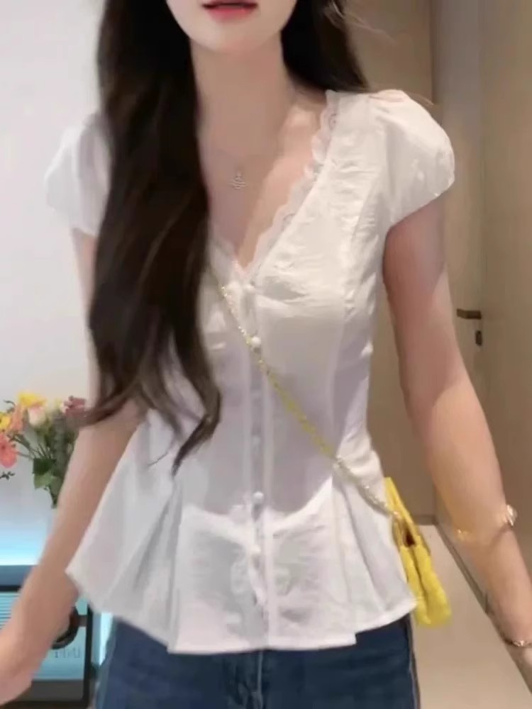 프렌치 레이스 v 넥 반팔 화이트 셔츠 여성 여름 한국 세련된 셔츠 슬림 슬리밍 탑스토어 가기