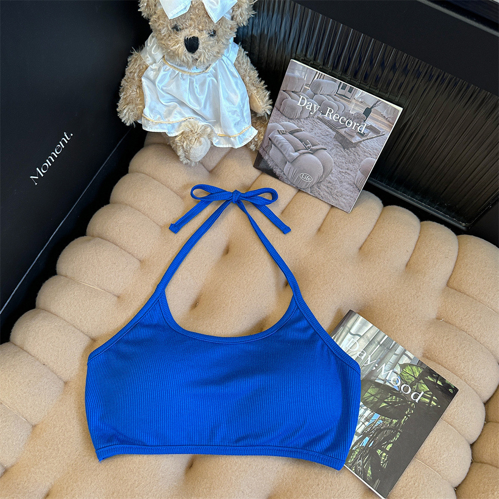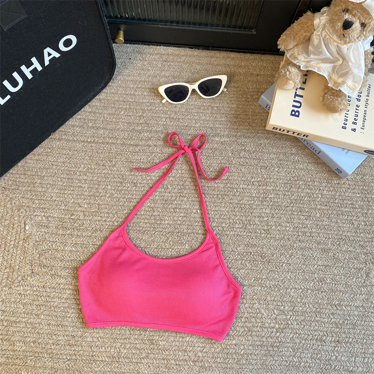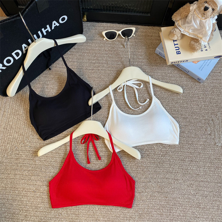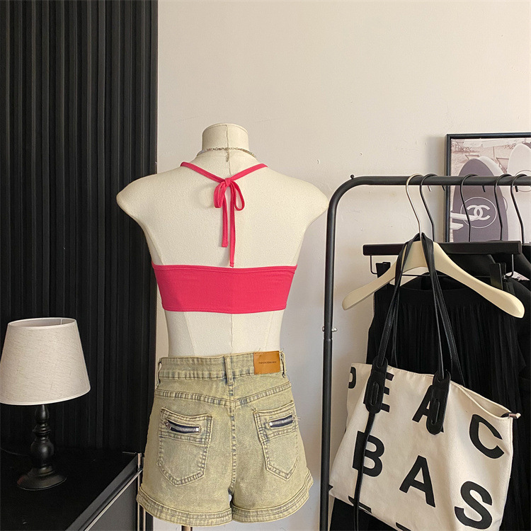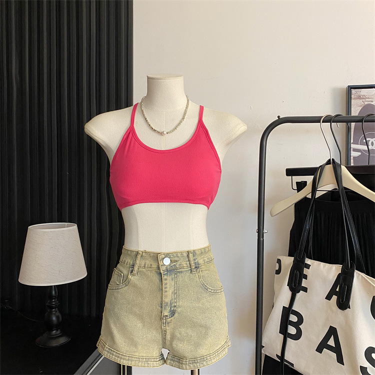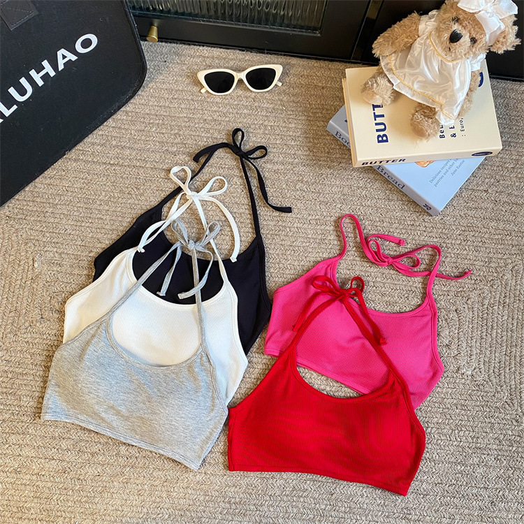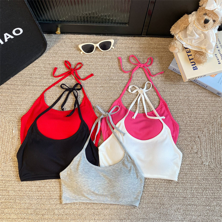 가슴 패드가 있는 여성용 핫걸 스몰 서스펜더 홀터넥 조끼 2024 새로운 섹시한 리조트 스타일 달콤하고 매운 바닥 탑