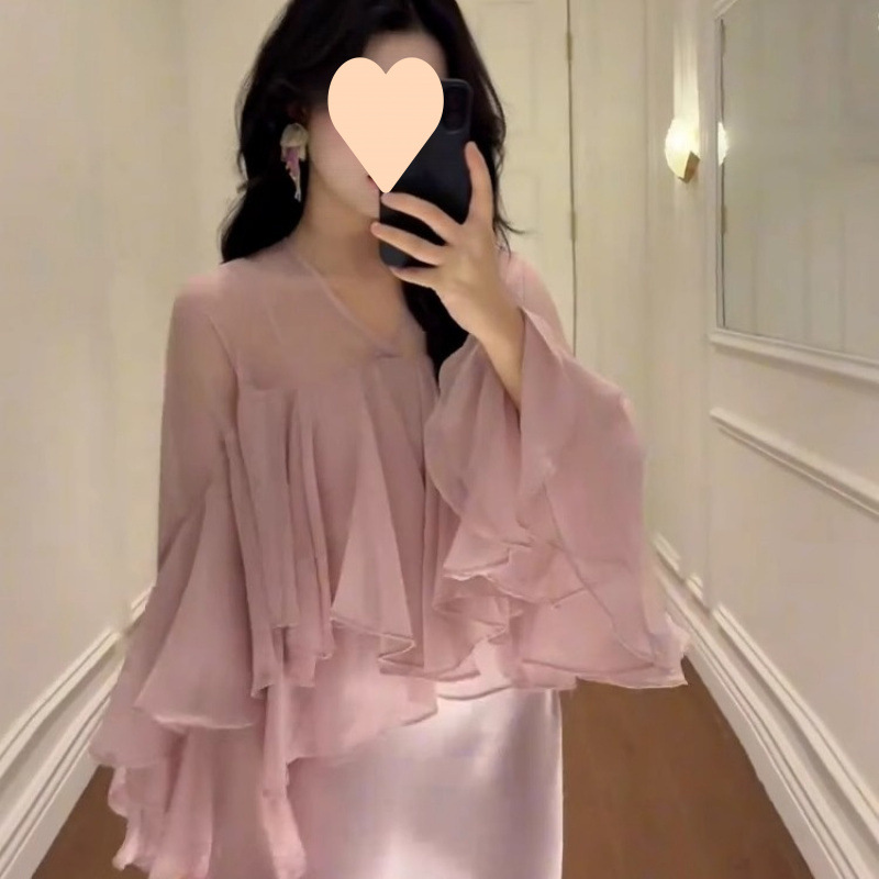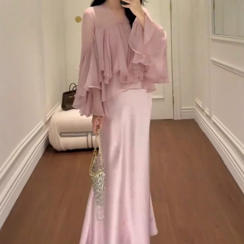 여성을위한 프렌치 핑크 정장 스커트 2025 러플 스위트 쉬폰 셔츠 힙 커버 피쉬 테일 스커트 투피스 세트