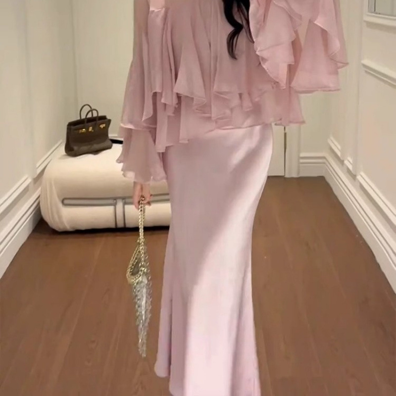 여성을위한 프렌치 핑크 정장 스커트 2025 러플 스위트 쉬폰 셔츠 힙 커버 피쉬 테일 스커트 투피스 세트스토어 가기
