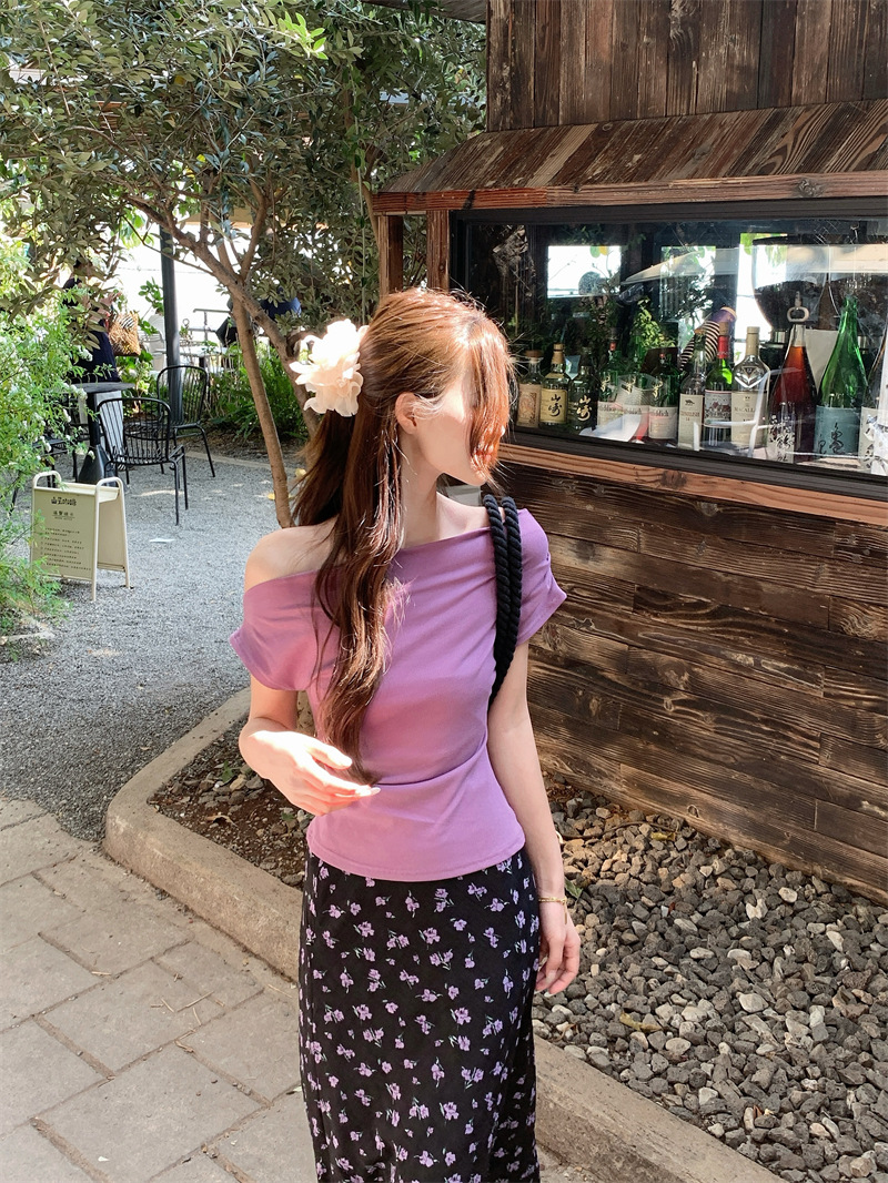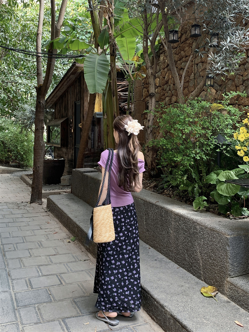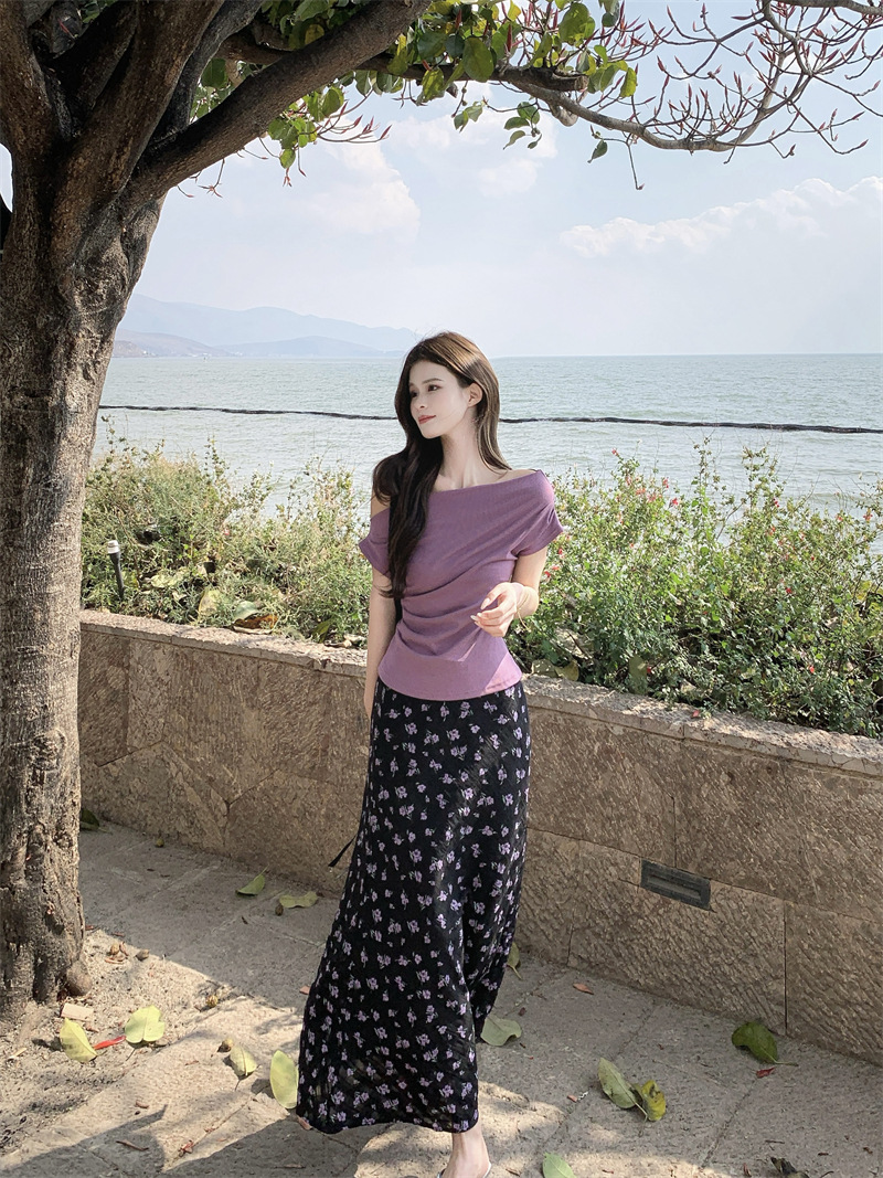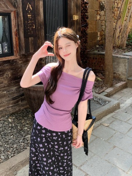 원숄더 슬림핏 플리츠 반팔 티셔츠 하이웨이스트 플로럴 스커트 2026 여름 패션 세트 여성용 ins스토어 가기