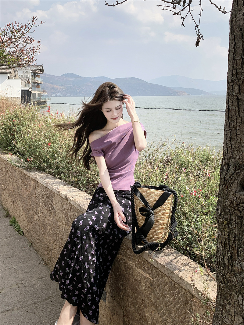 원숄더 슬림핏 플리츠 반팔 티셔츠 하이웨이스트 플로럴 스커트 2026 여름 패션 세트 여성용 ins