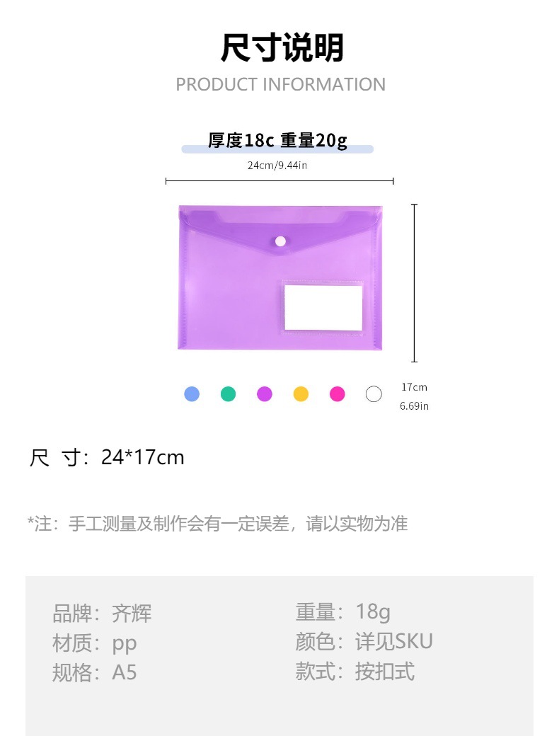 공장 직접 판매 투명 A5 스냅 파일 가방 파일 가방 명함 포켓이있는 학생 보관 가방 PP 지폐 보관