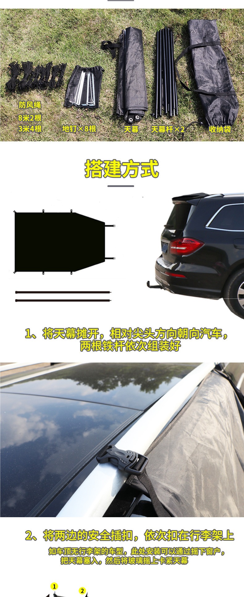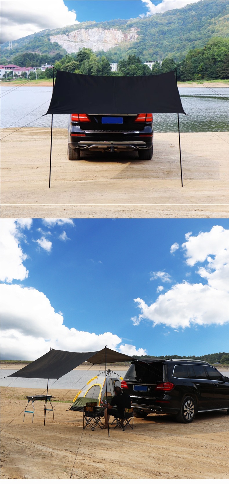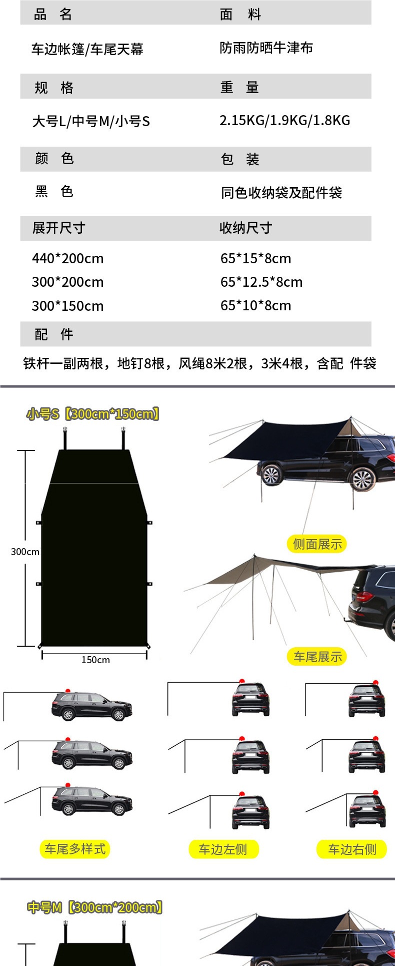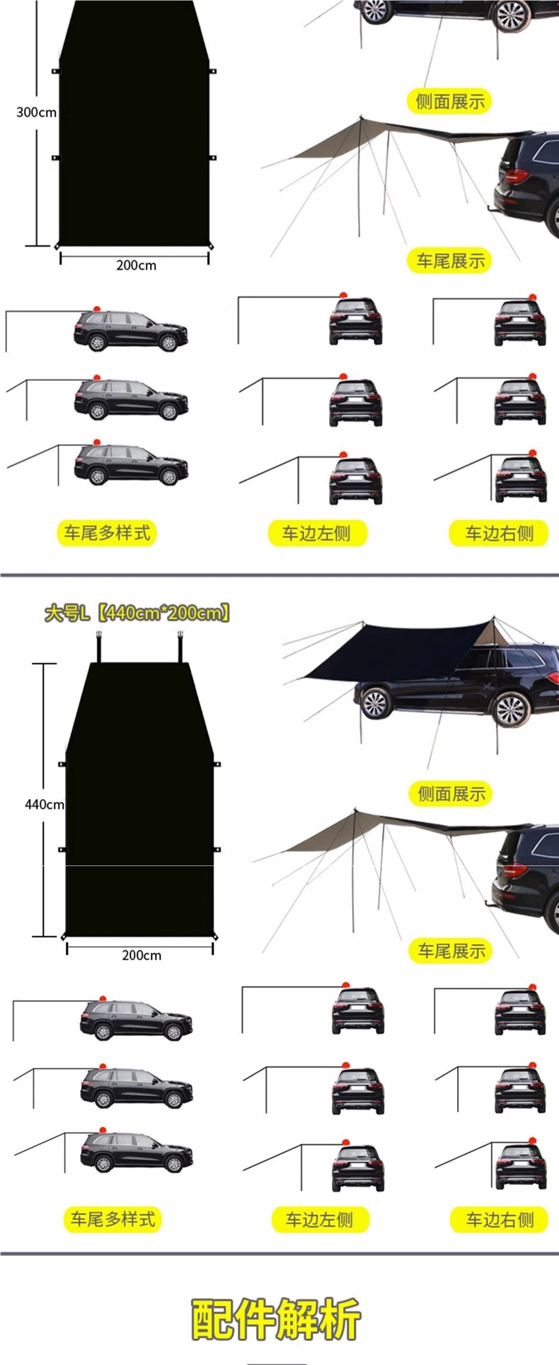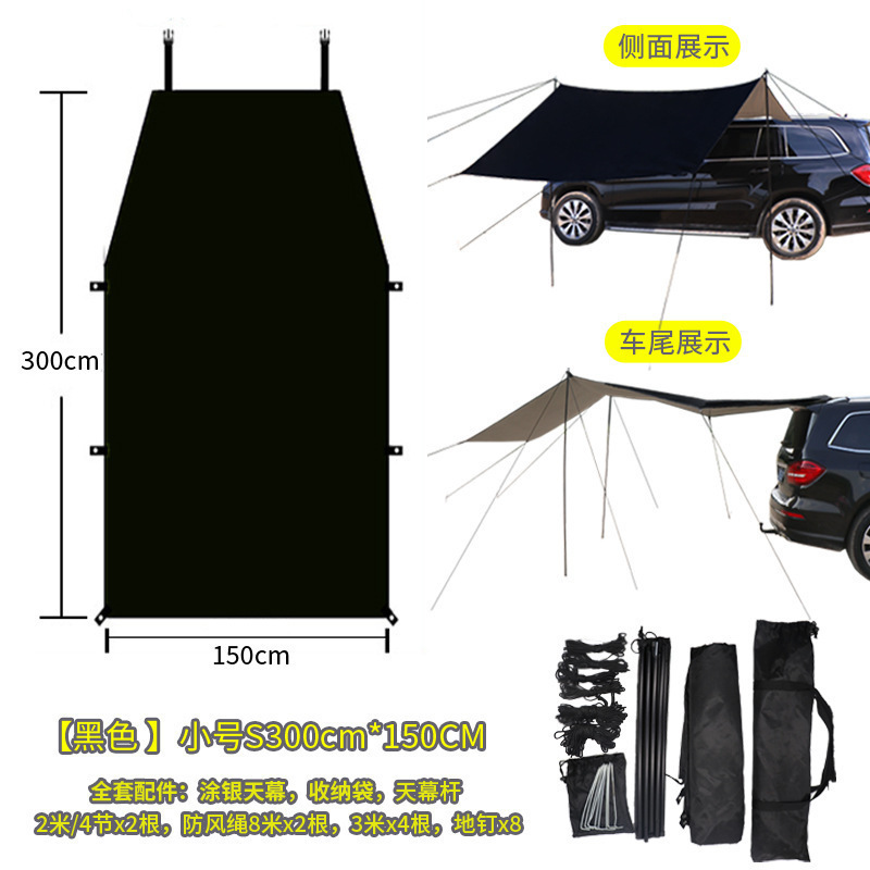 • 블랙 카 사이드 텐트 [액세서리 풀 세트 포함] 중간 사이즈 M 300*200cm, 여러 사람