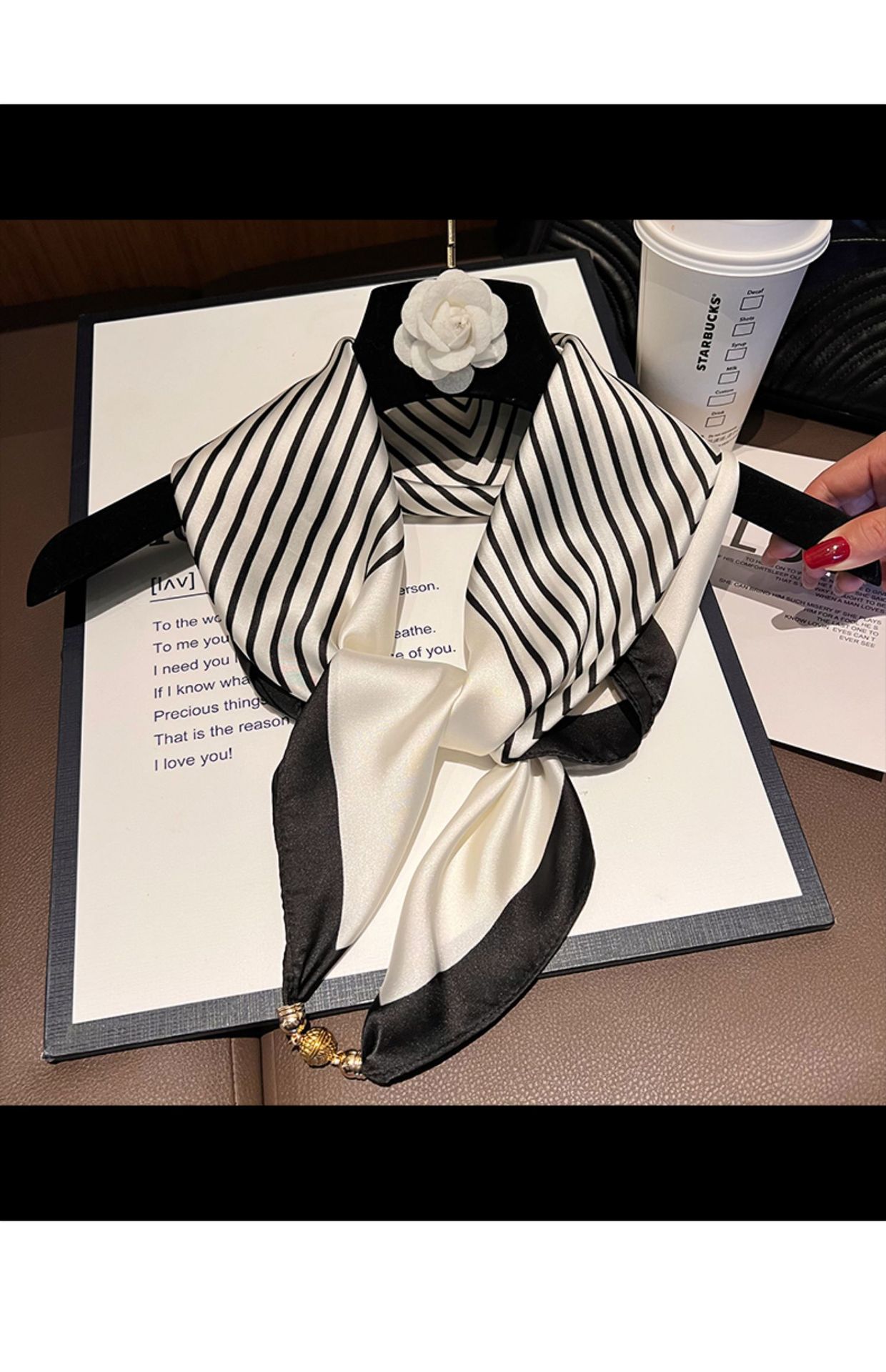 한국 스타일 스트라이프 스몰 스퀘어 스카프, 분위기 있는 실크 스카프, 여성용 스퀘어 스카프, 마그네틱 버클 삼각 스카프, 셔츠 넥 워머, 얇은 스카프, 넥 스카프