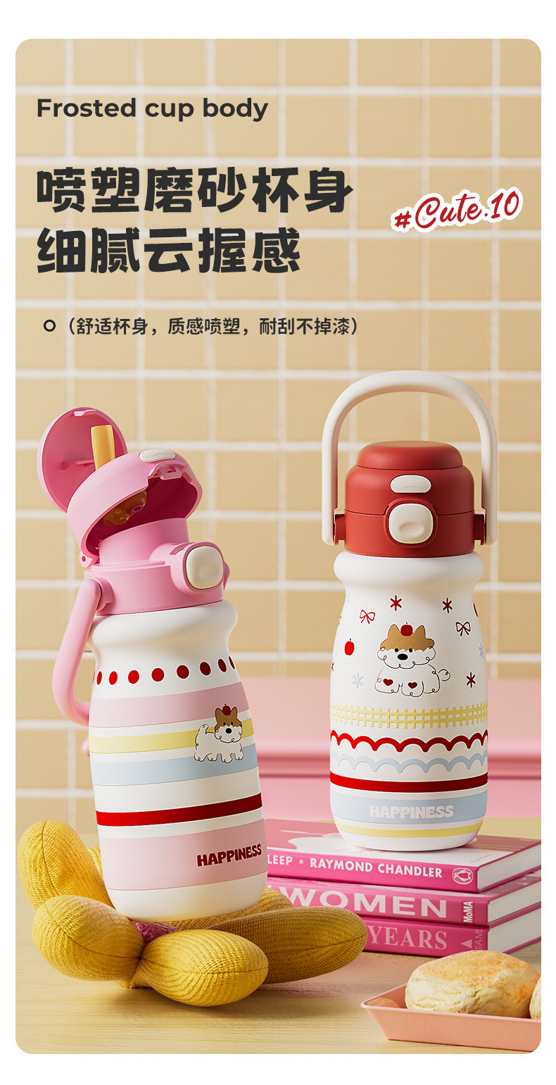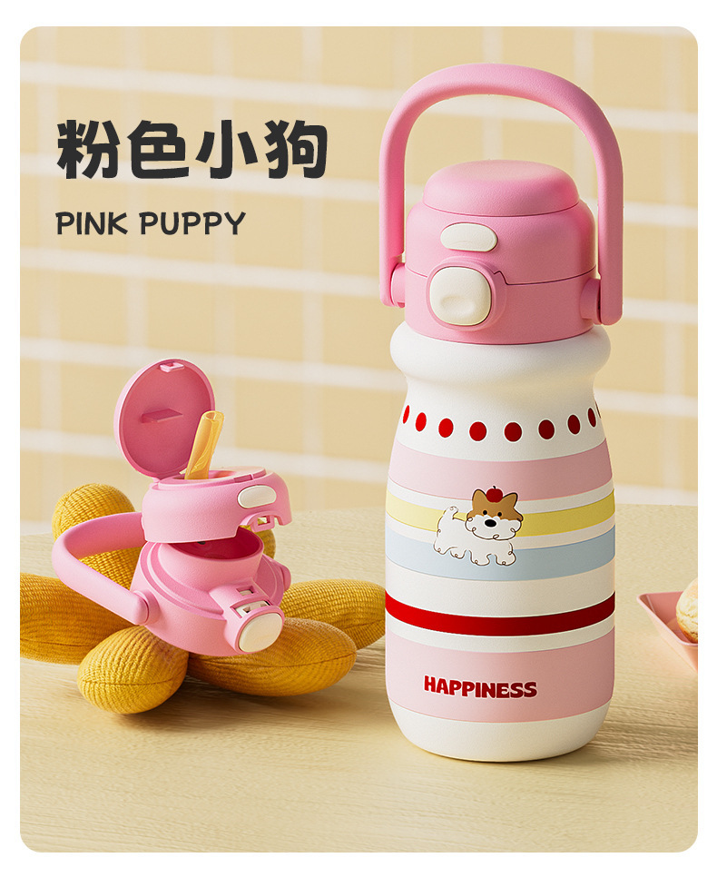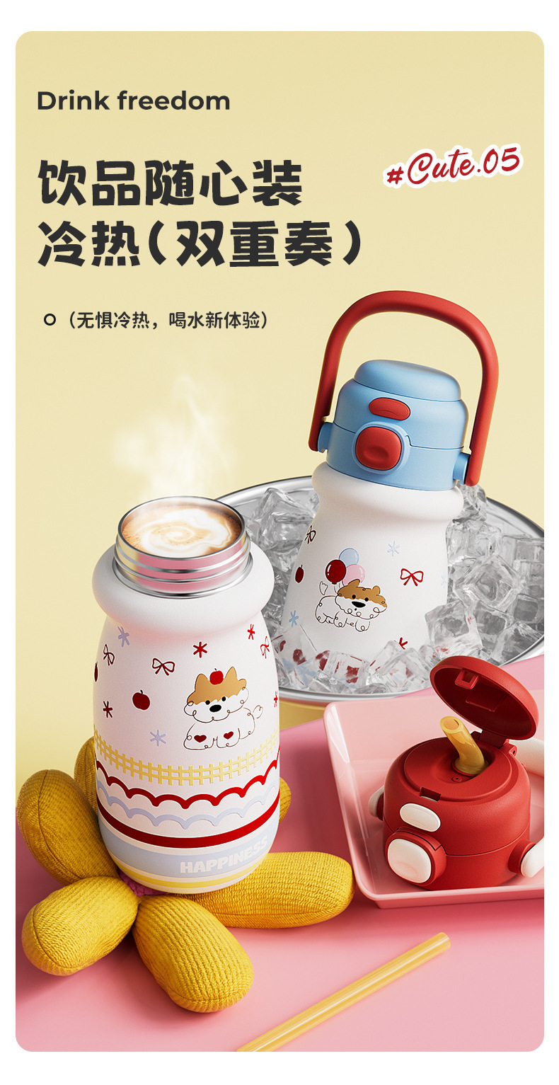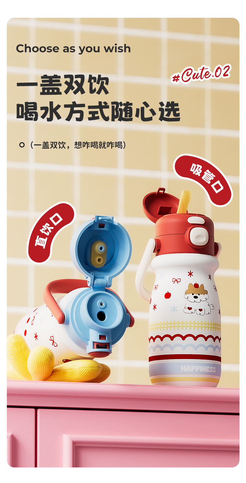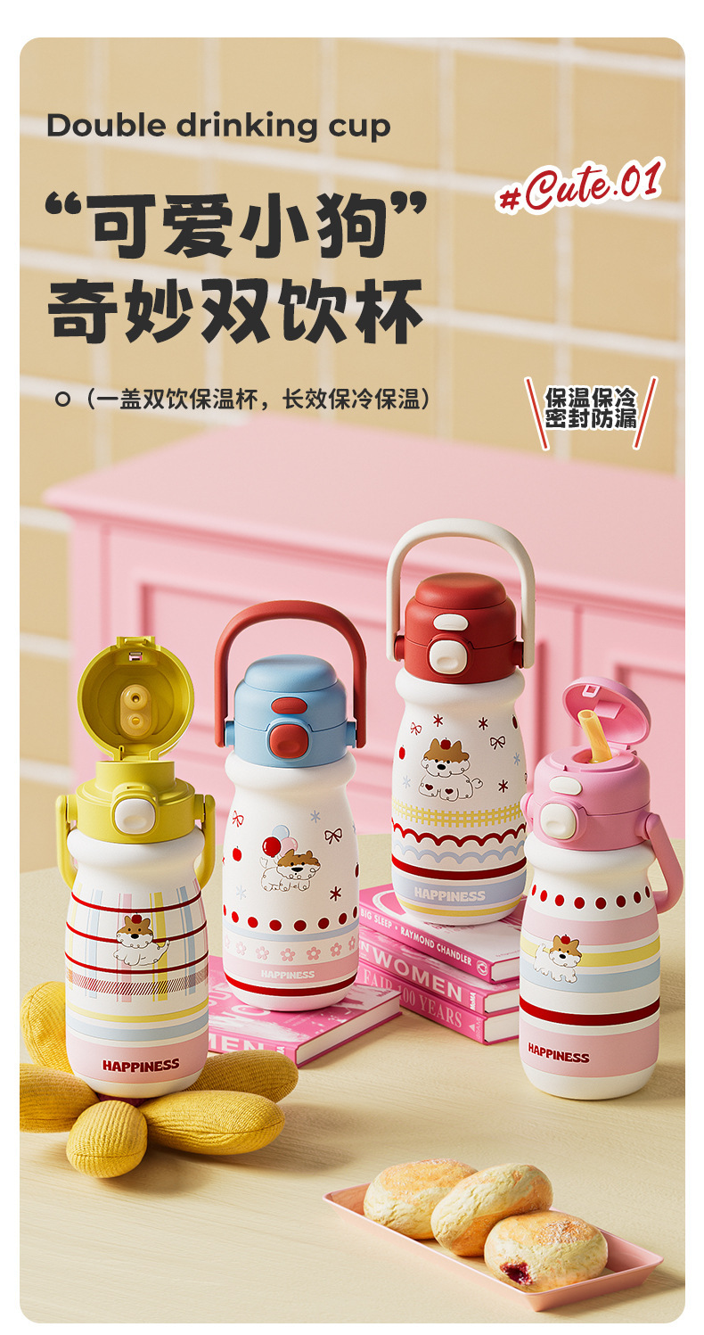 새로운 스타일의 손잡이가 있는 이중 빨대 컵, 보온병 컵, 멋진 만화 학생 물컵, 보온 및 냉각, 세련된 휴대용 주전자스토어 가기