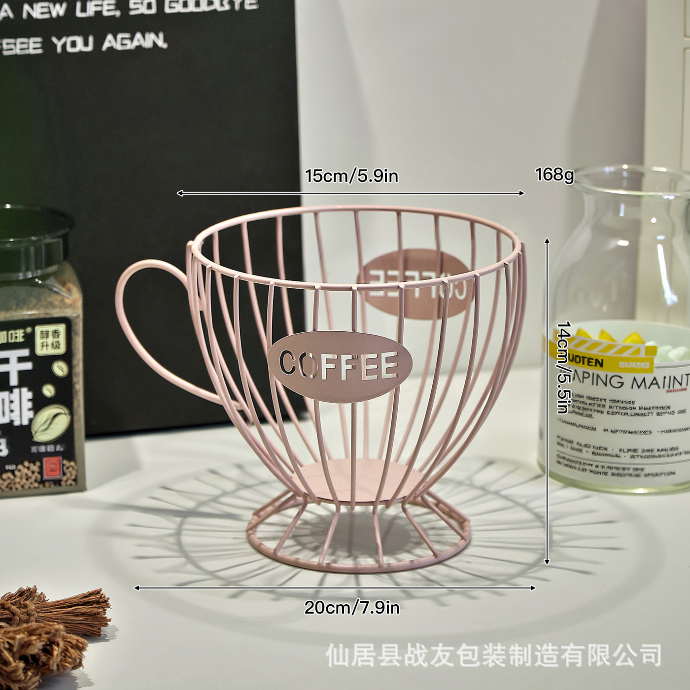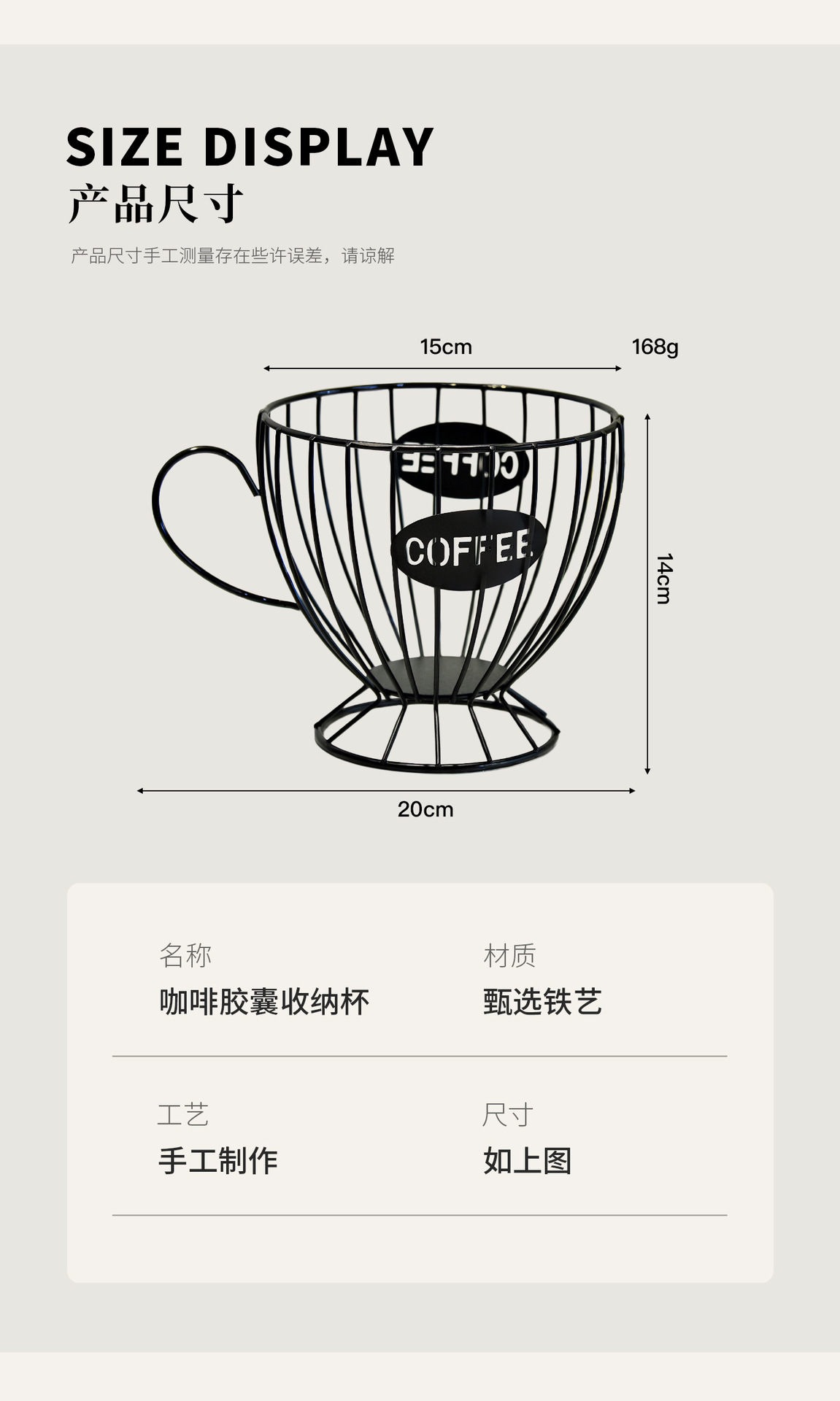 咖啡杯收纳篮 货号;529 材质;铁 净重;0.17kg 整箱重量;19.325kg 装箱率;100 产品尺寸;20*15*14 内盒尺寸;21*17*16 外箱尺寸;66.7*62.1*60.8