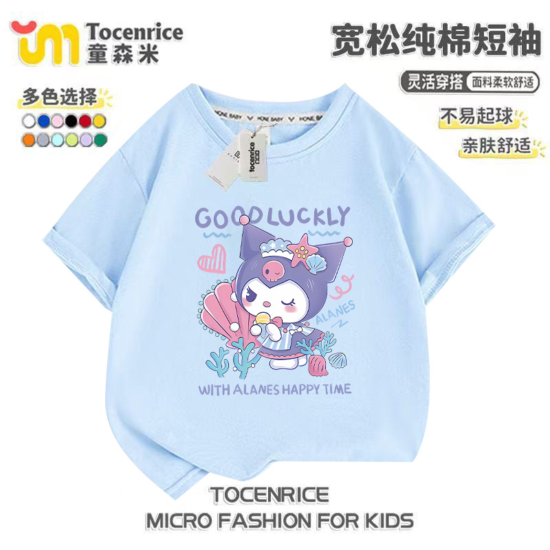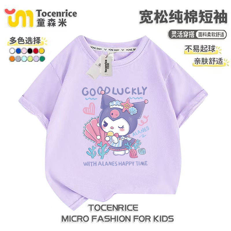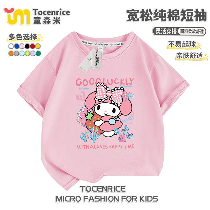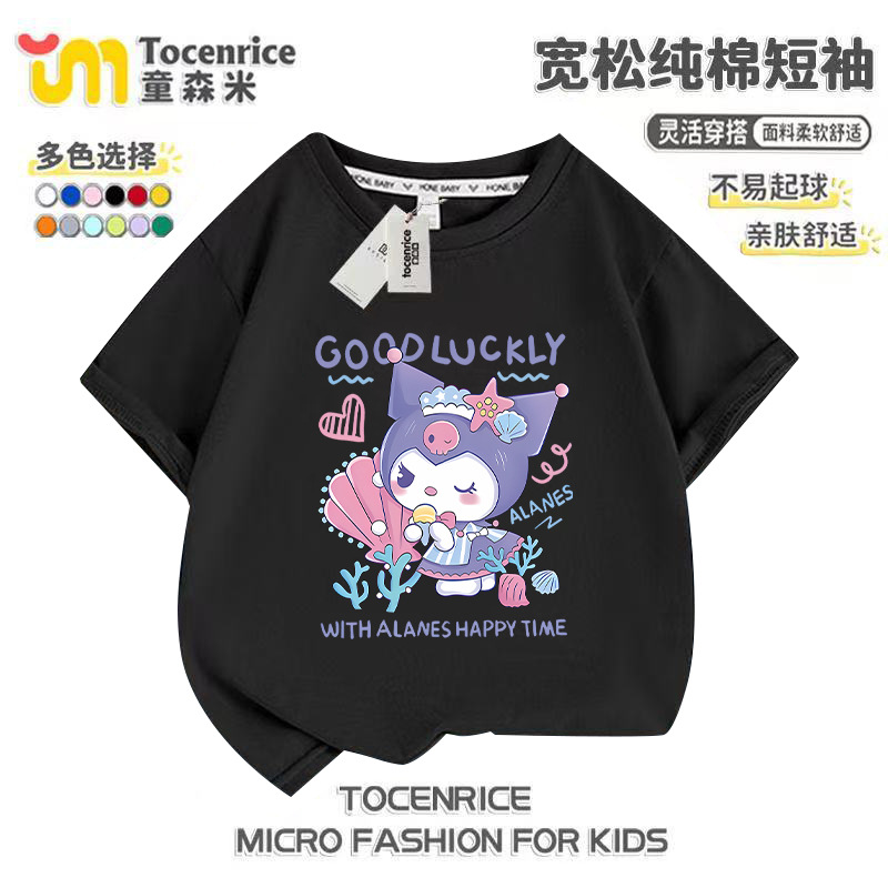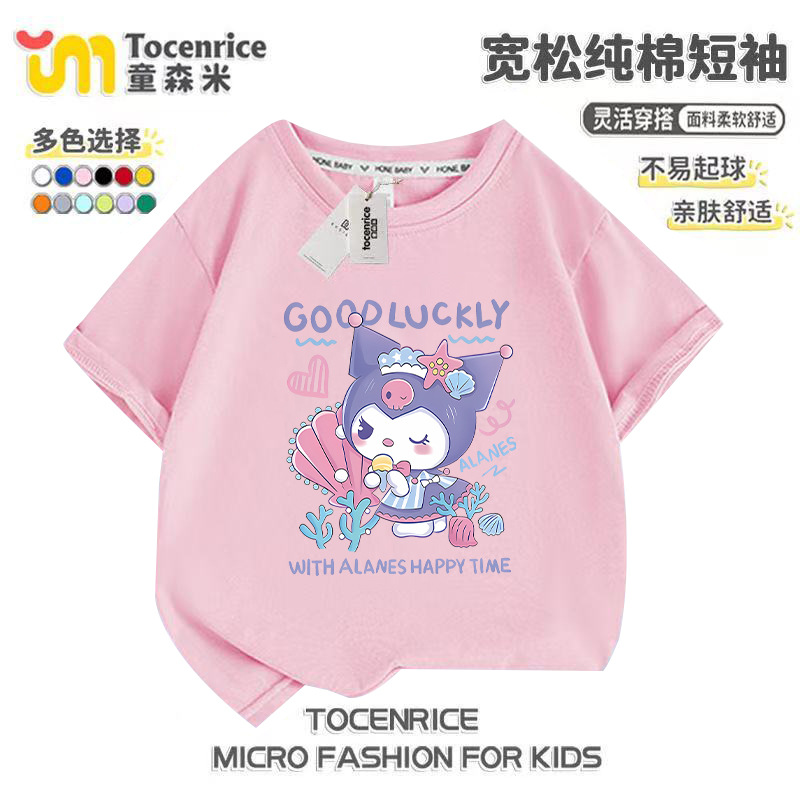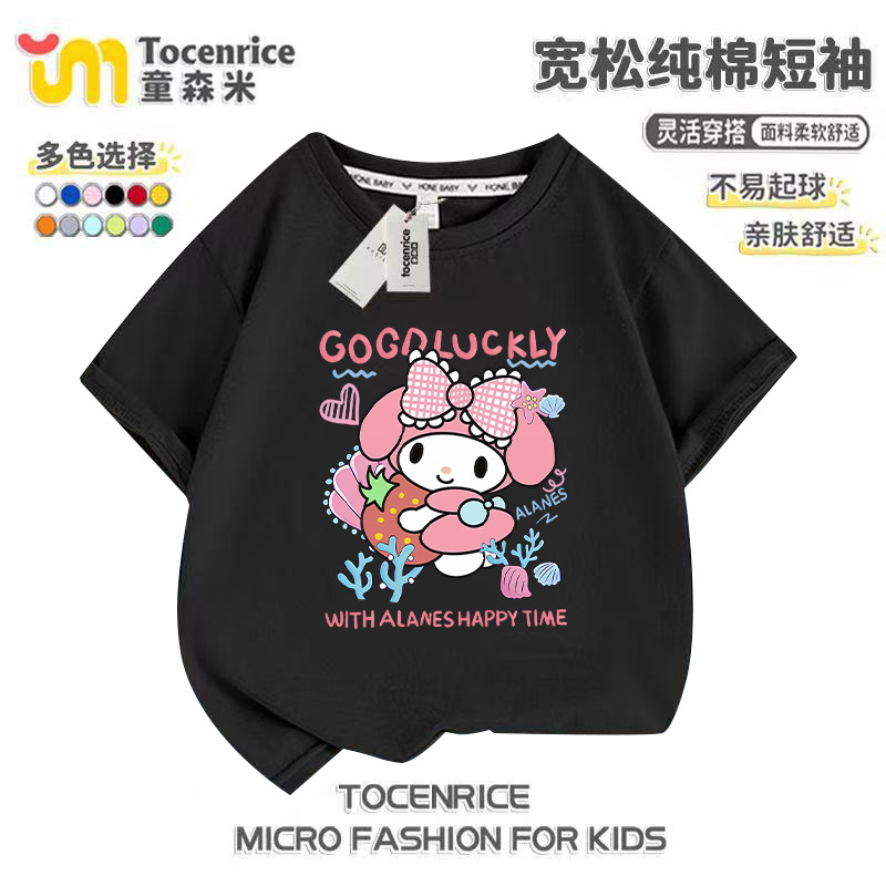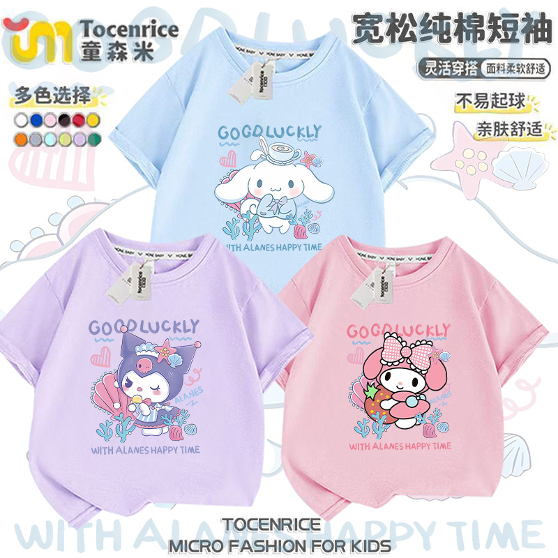 새로운 Kuromi Melody 어린이 반팔 티셔츠 소녀 계피 개 반팔 아기 소녀 여름 바닥 셔츠스토어 가기