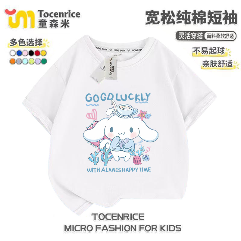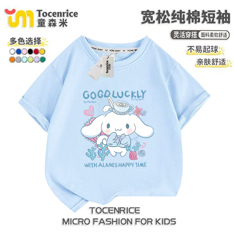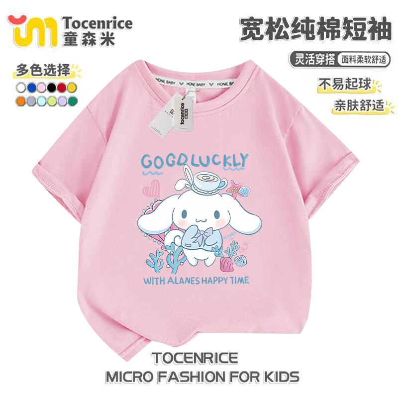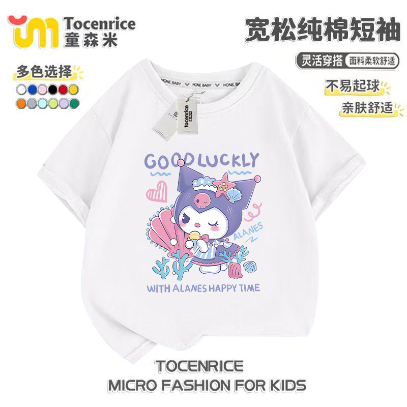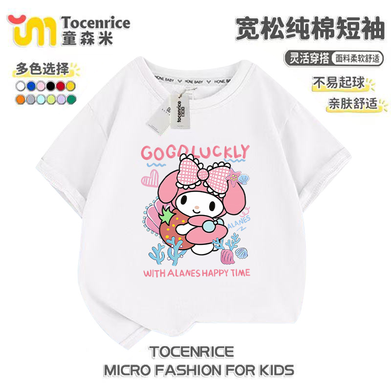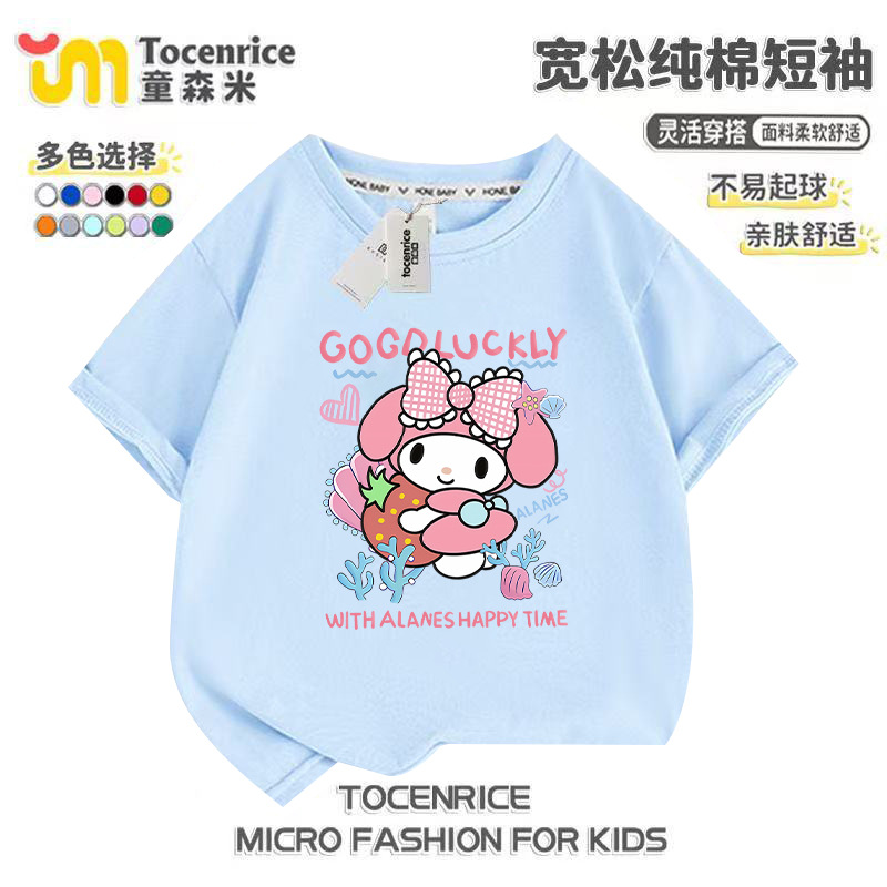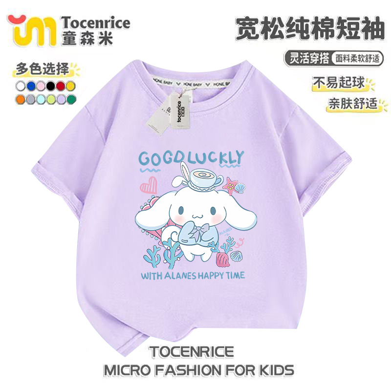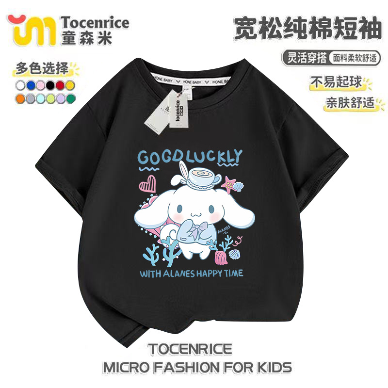 새로운 Kuromi Melody 어린이 반팔 티셔츠 소녀 계피 개 반팔 아기 소녀 여름 바닥 셔츠스토어 가기