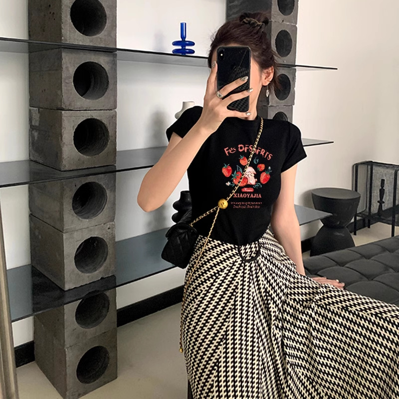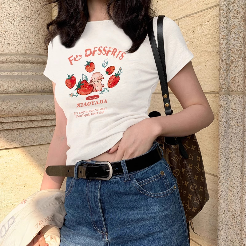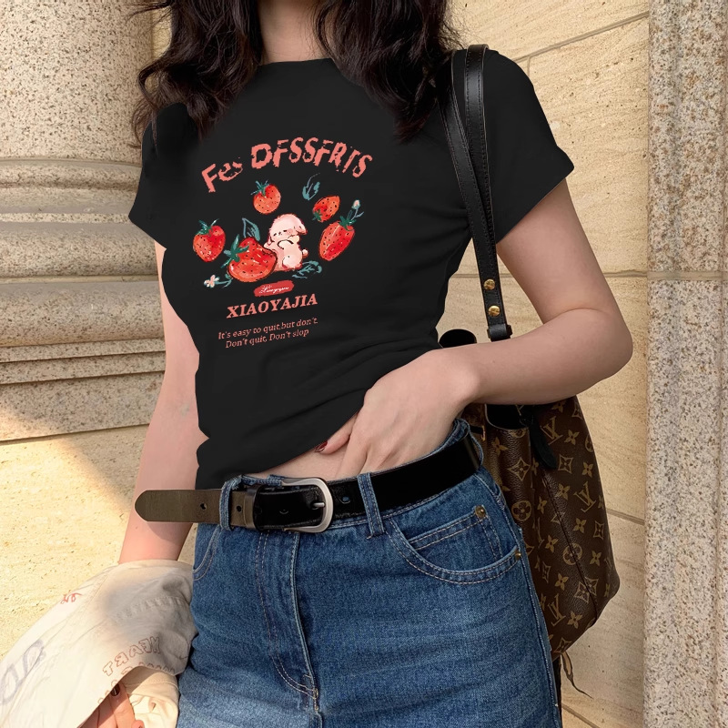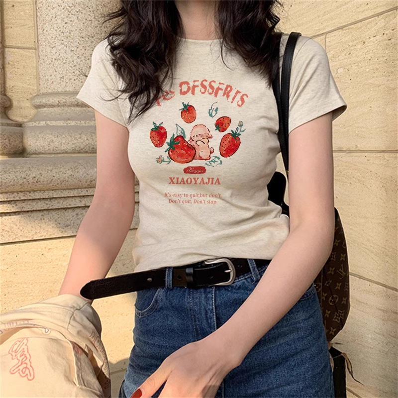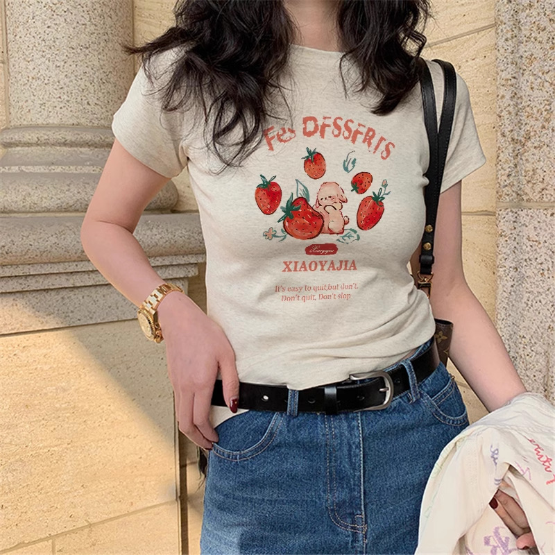 아메리칸 레트로 오른쪽 어깨 만화 딸기 토끼 반팔 티셔츠 여성 여름 새로운 달콤한 핫 소녀 캐주얼 다목적 탑스토어 가기