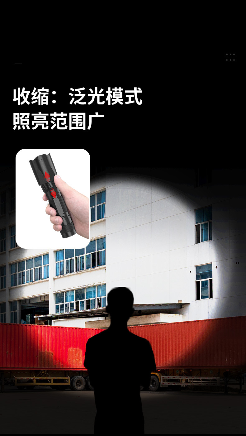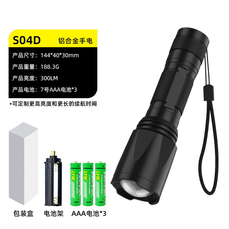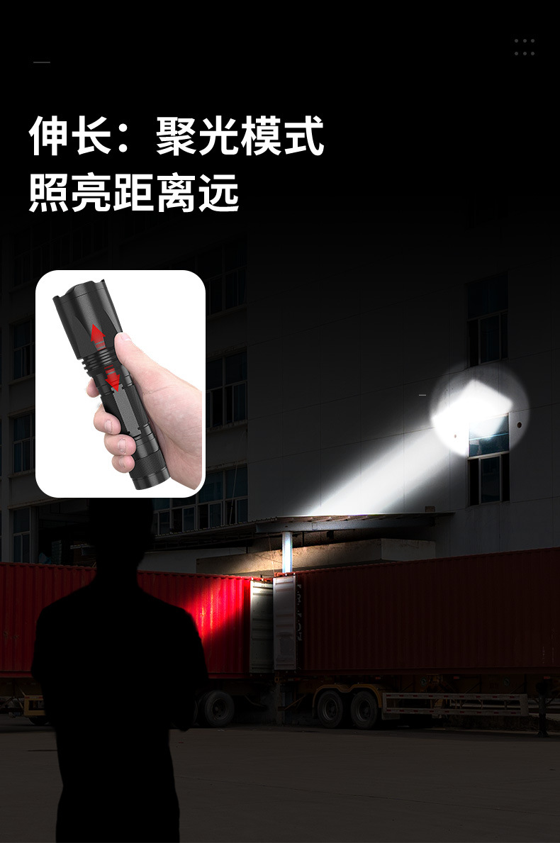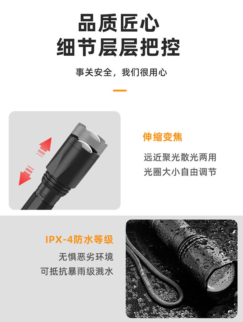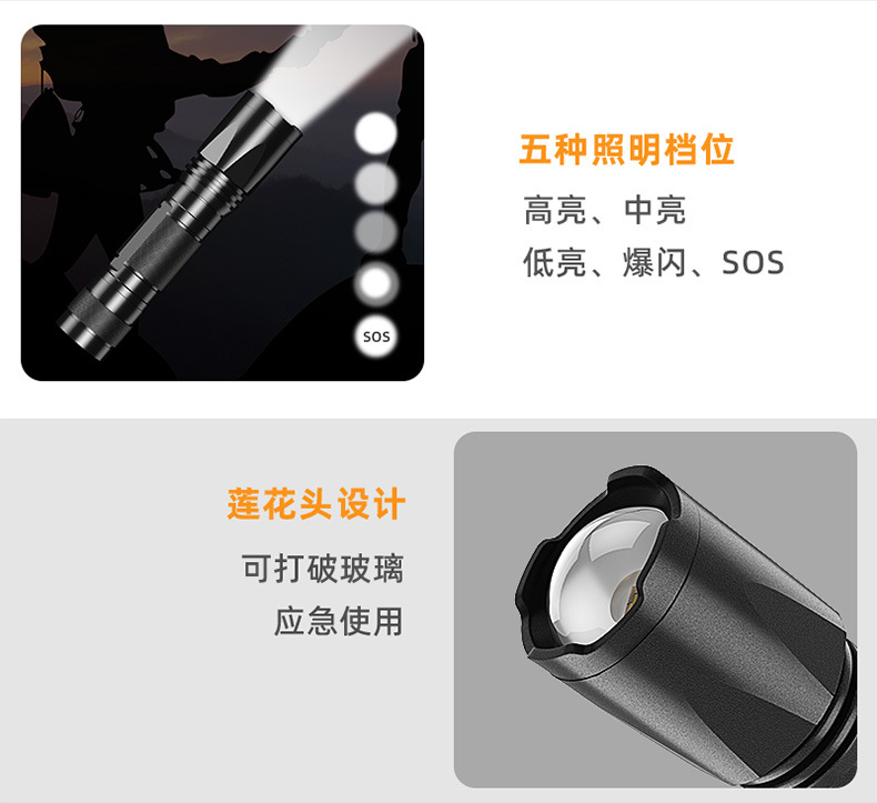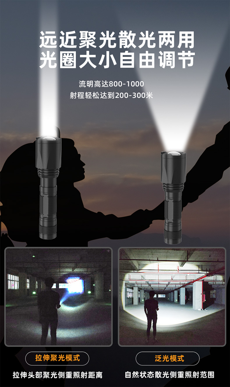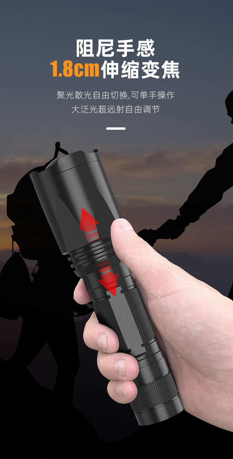 줌 장거리 강한 빛 손전등, 밝은 야외 하이킹 조명, 긴 배터리 수명, 휴대용 비상 조명