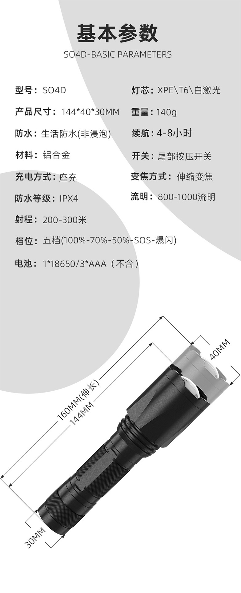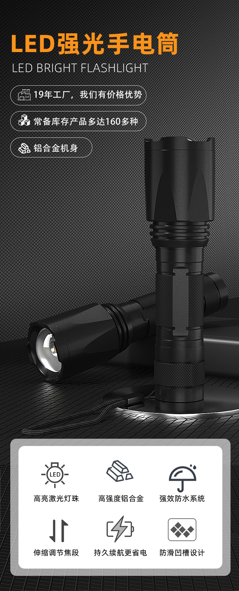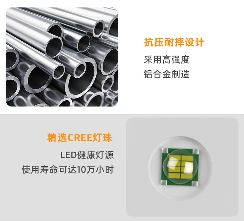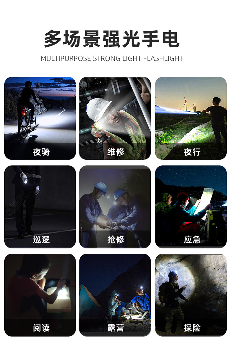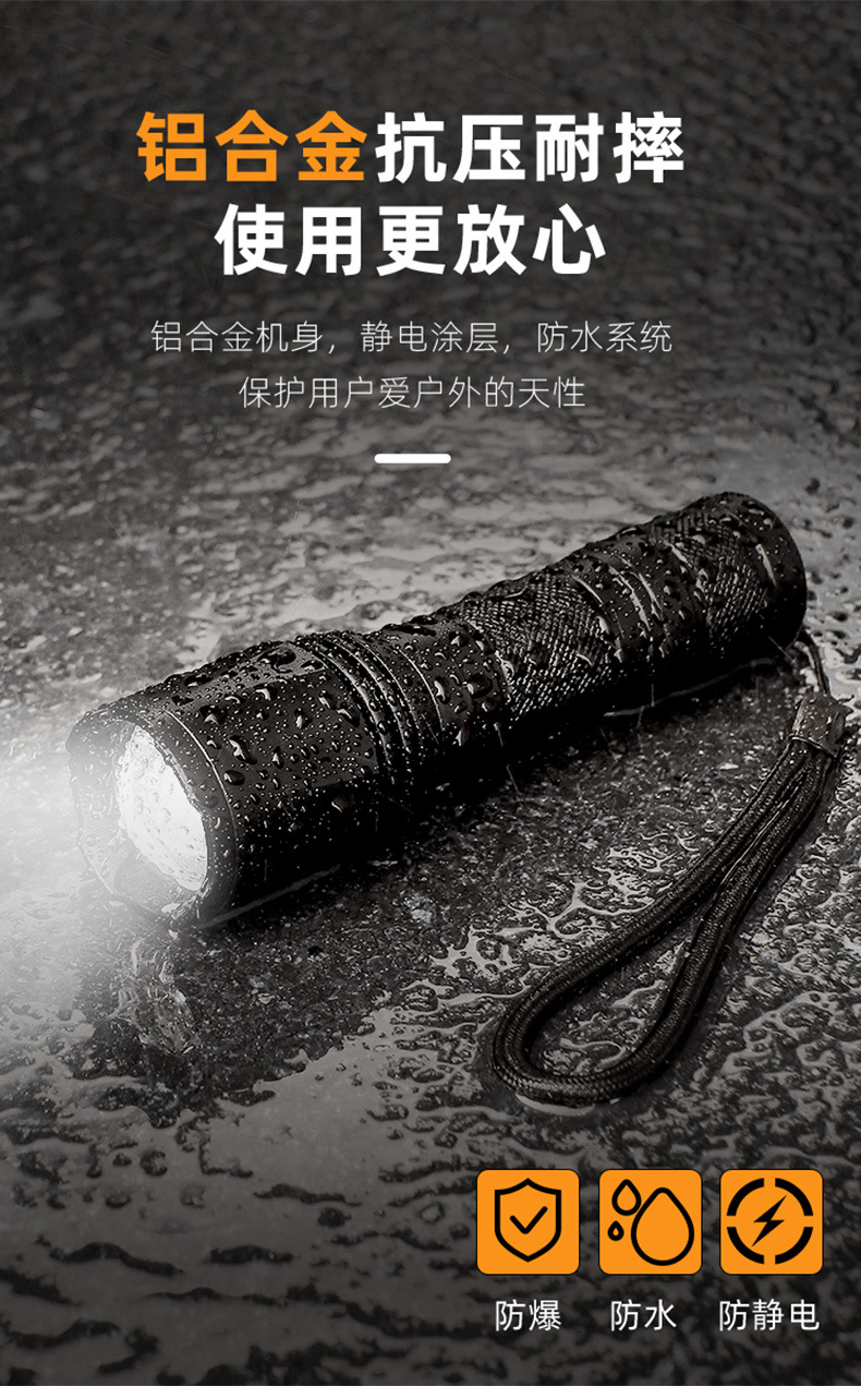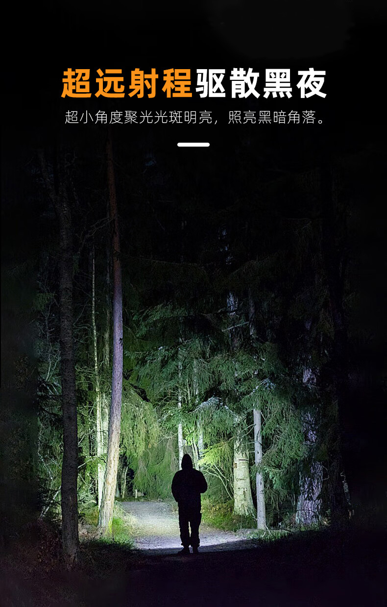줌 장거리 강한 빛 손전등, 밝은 야외 하이킹 조명, 긴 배터리 수명, 휴대용 비상 조명