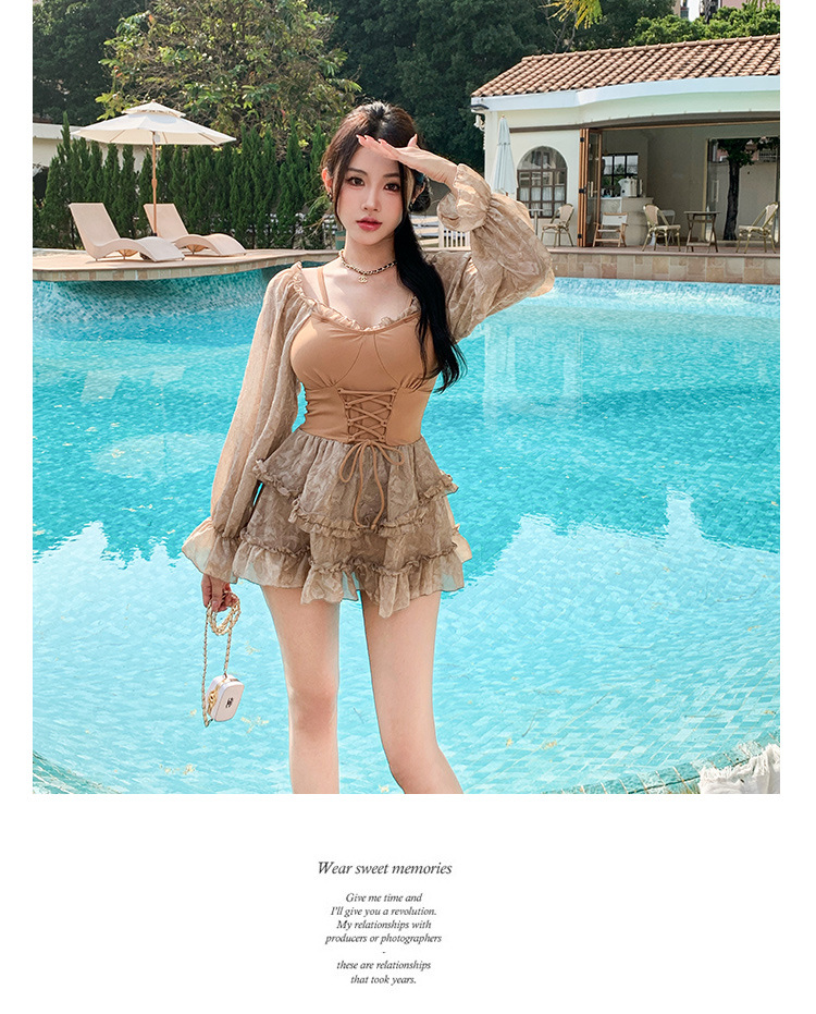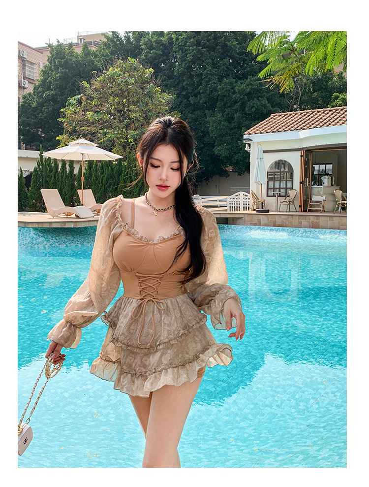 수영복 여성 긴팔 자외선 차단 원피스 스커트 스타일 보수적 뚱뚱한 mm 100kg 슬리밍 및 살 커버 섹시한 원 숄더 온천