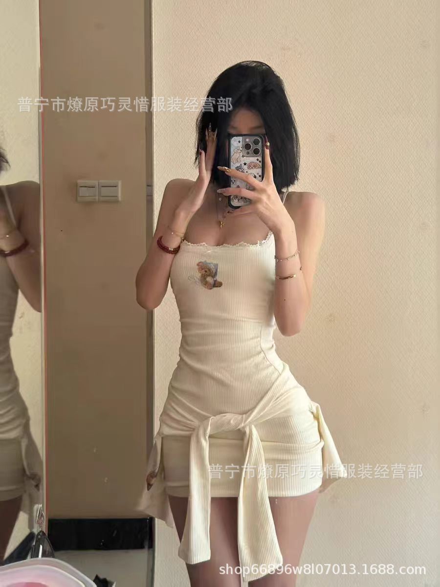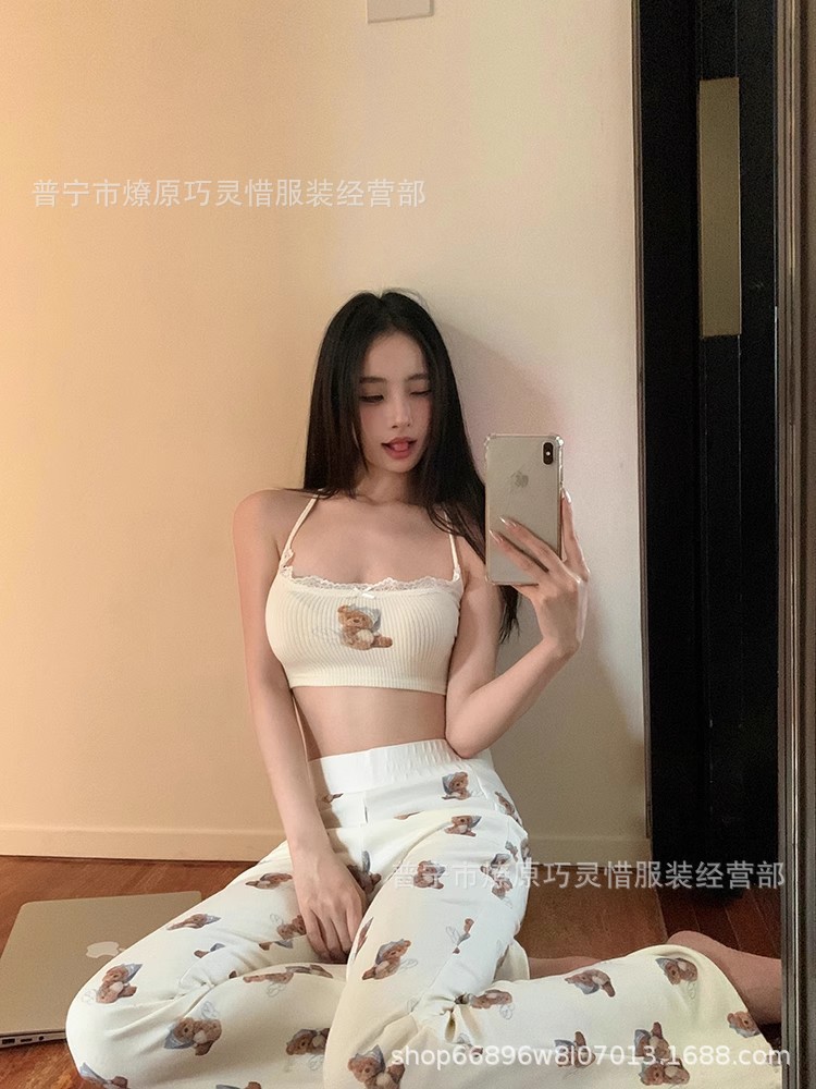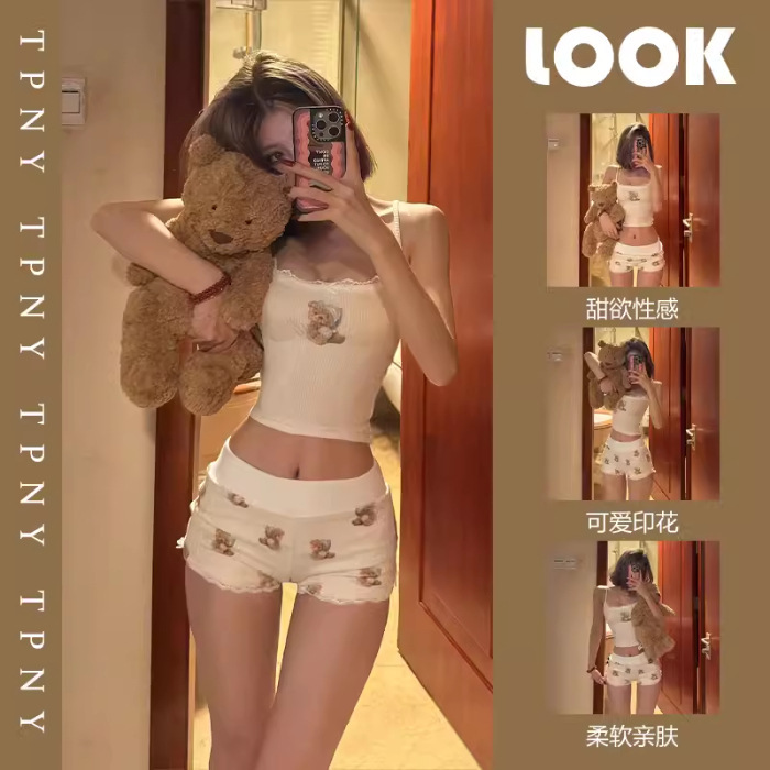 여자 순수한 욕망 곰 서스펜더 가슴 패드 잠옷 여성 여름 2024 새로운 슬림 섹시한 조끼 반바지 홈웨어
