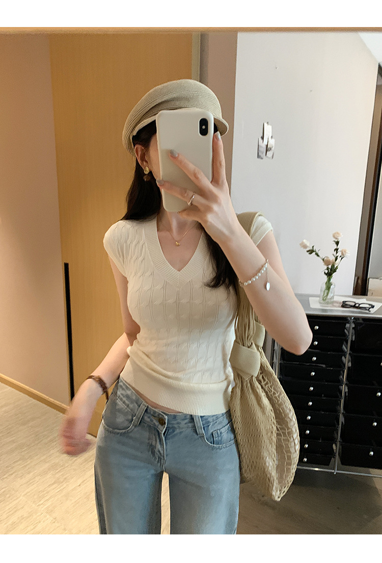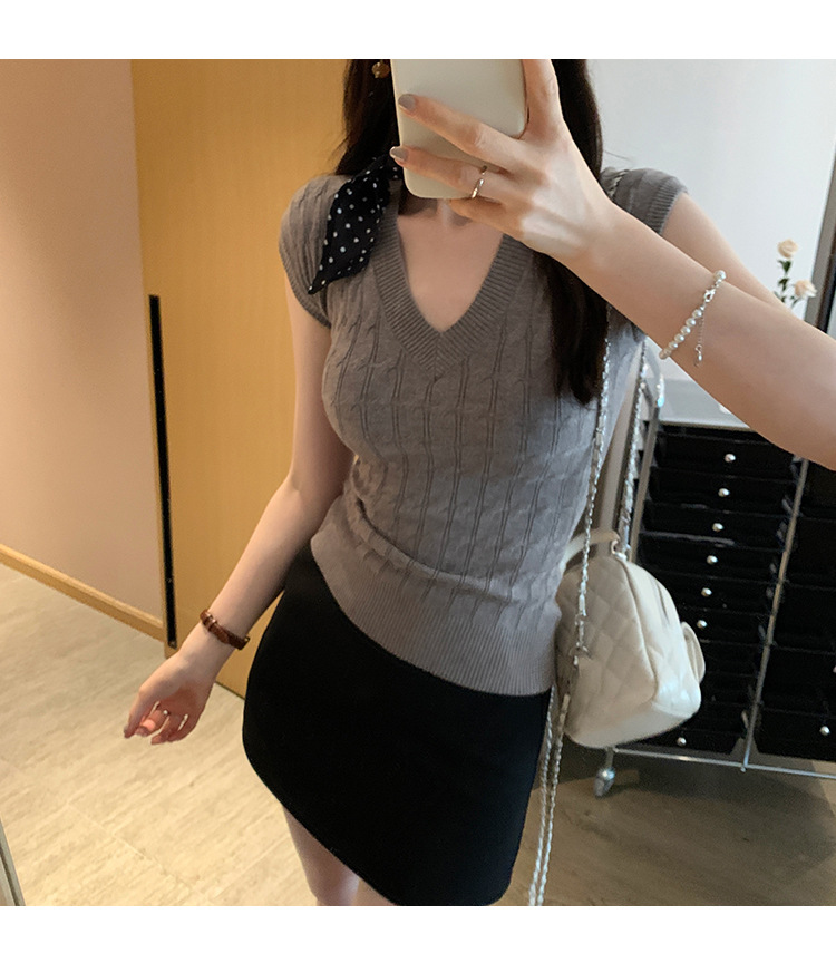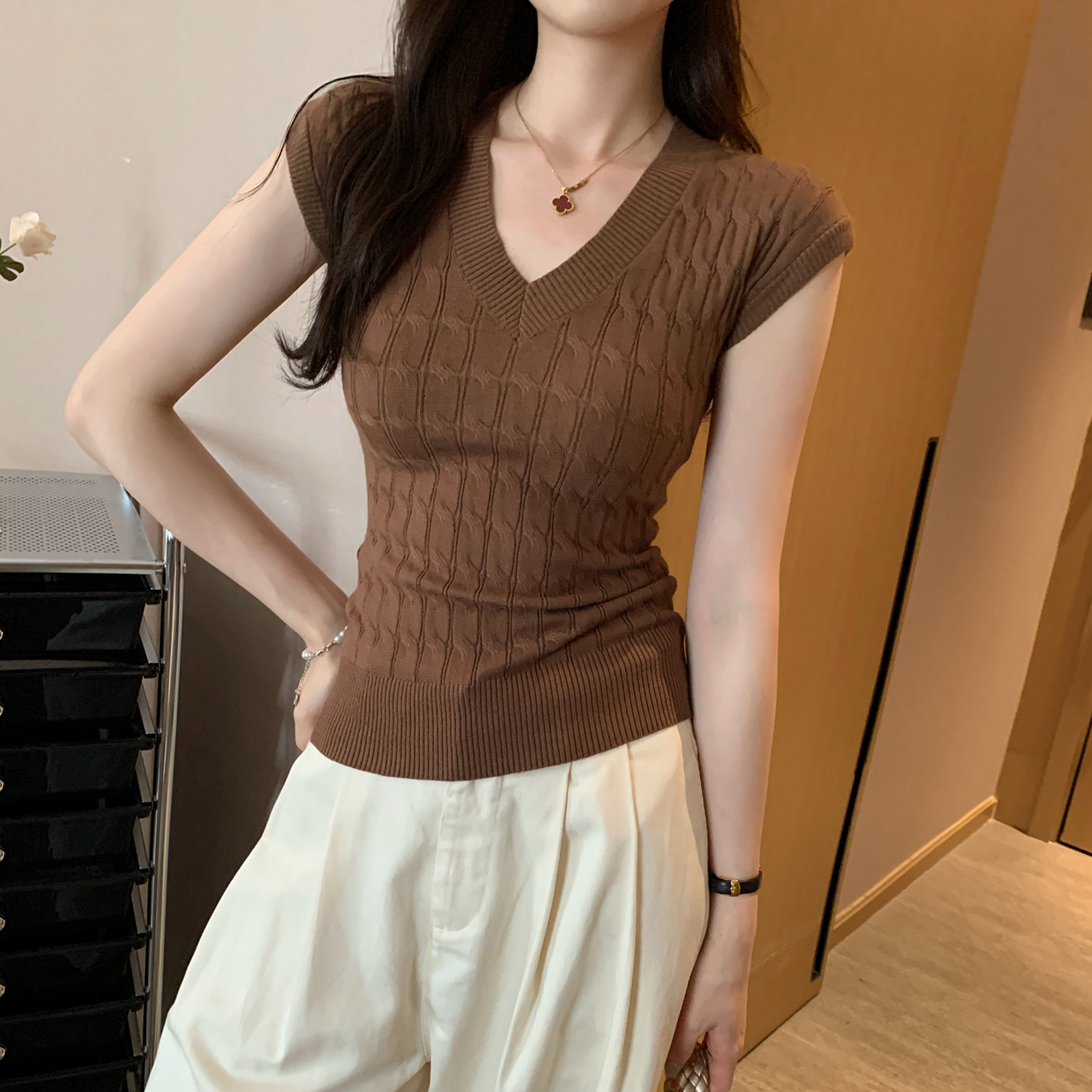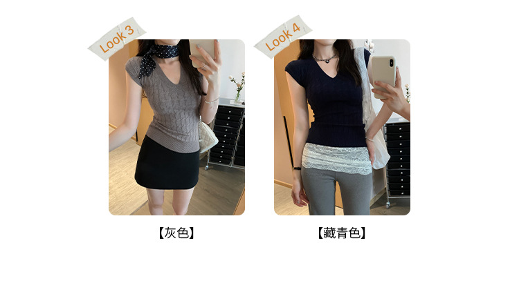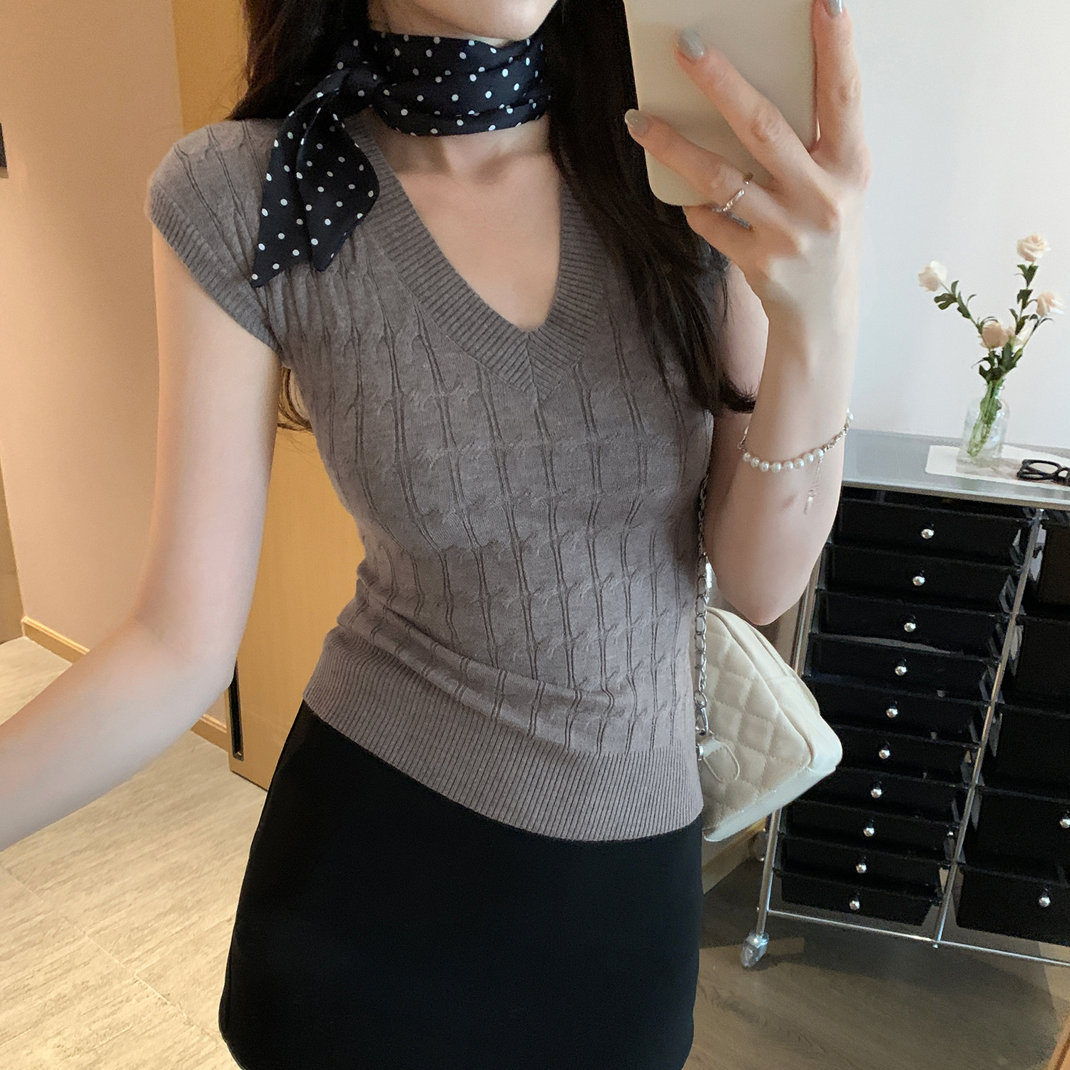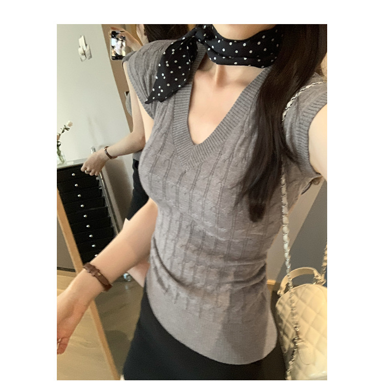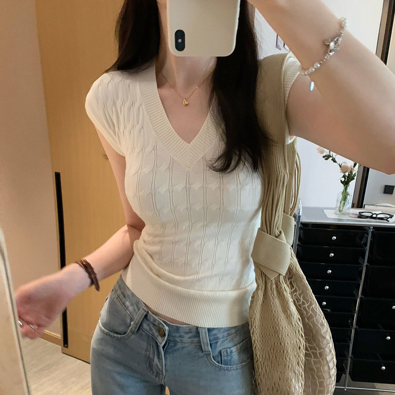 여성을위한 미국 복고풍 v 넥 니트 반팔 티셔츠 2025 여름 새로운 스타일 핫 소녀 연령 감소 슬림 스트레치 기질 탑