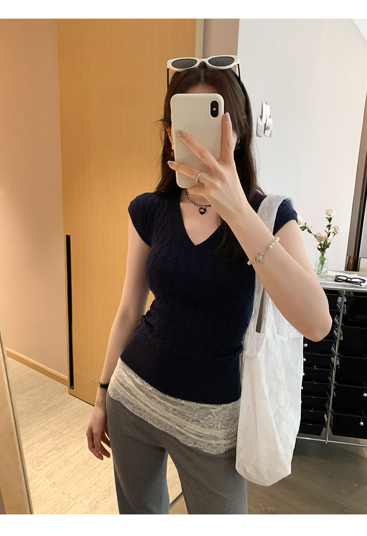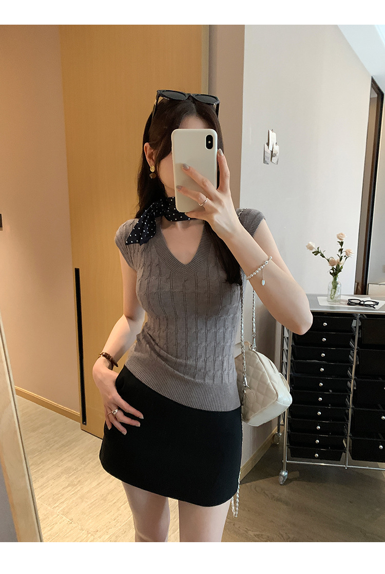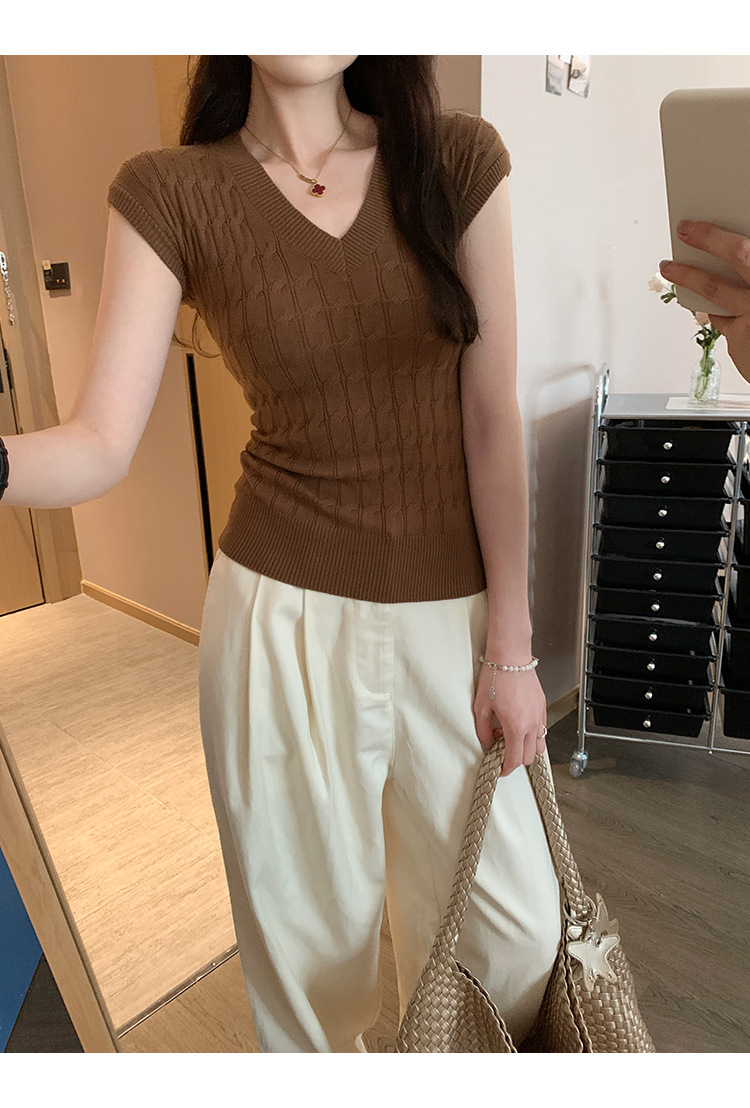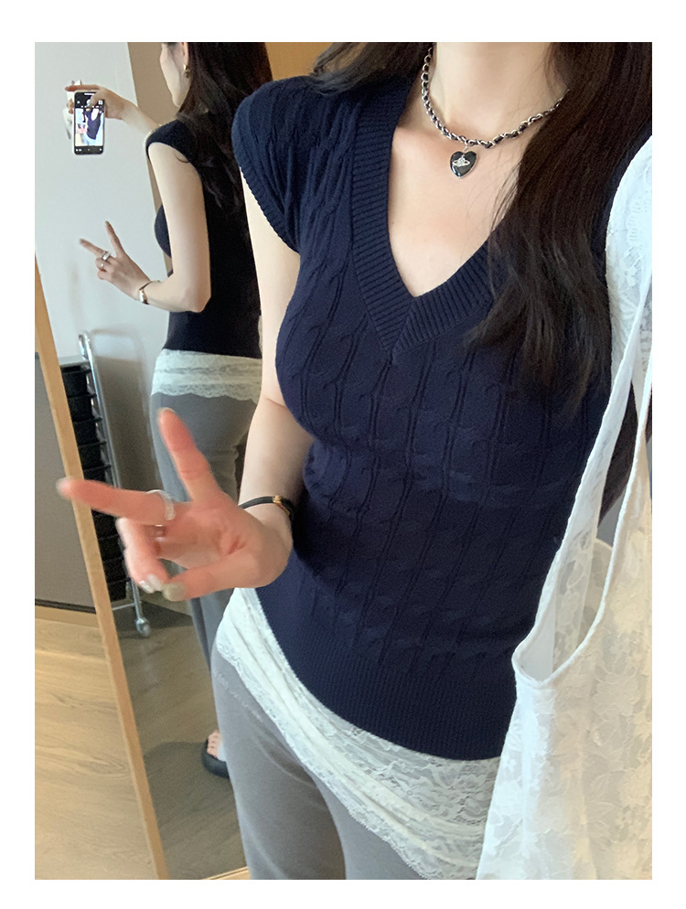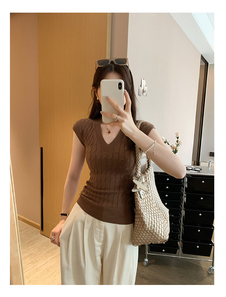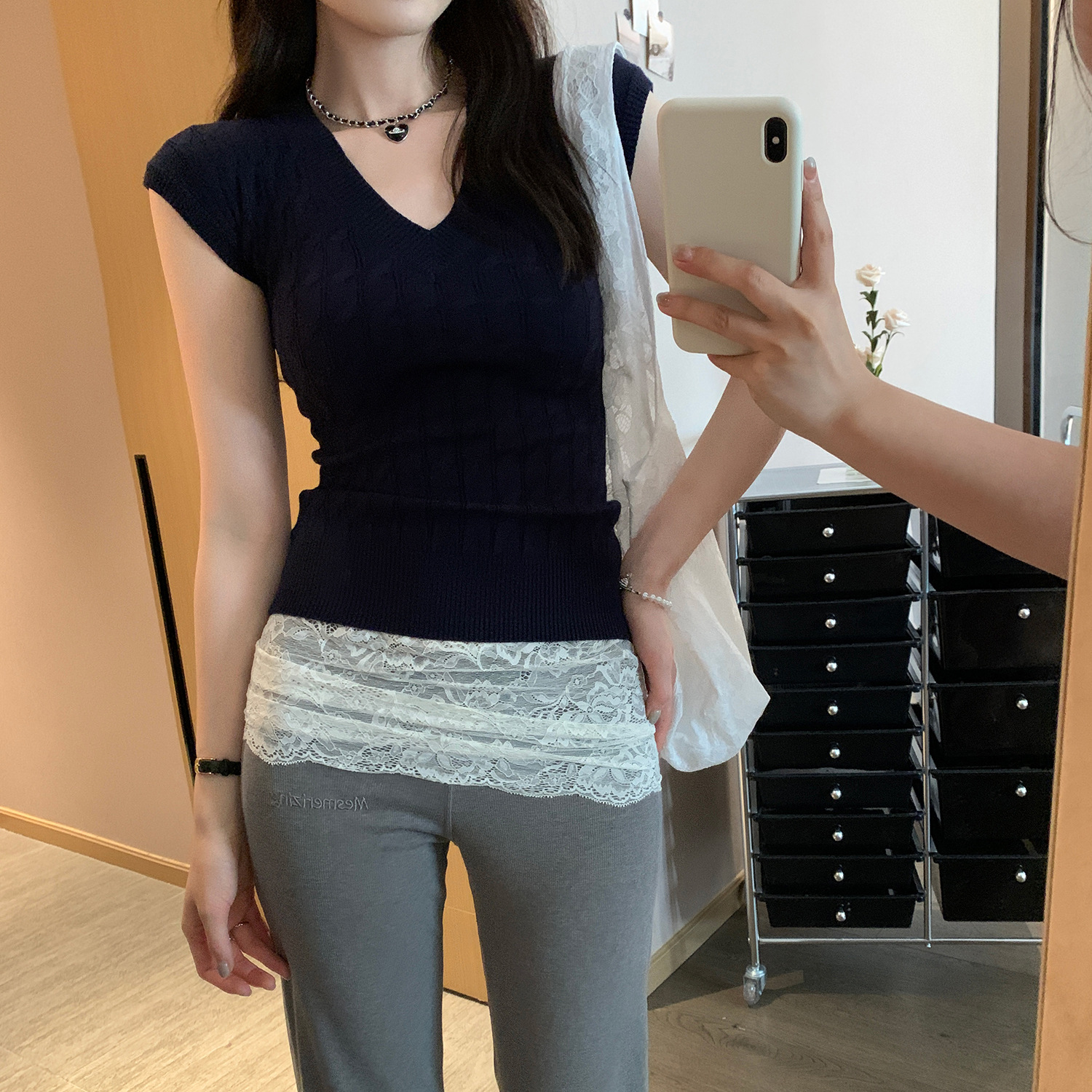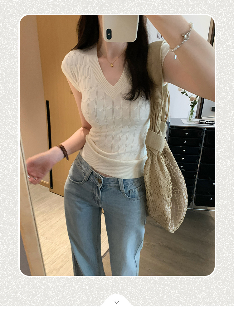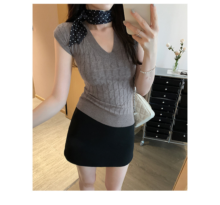 여성을위한 미국 복고풍 v 넥 니트 반팔 티셔츠 2025 여름 새로운 스타일 핫 소녀 연령 감소 슬림 스트레치 기질 탑