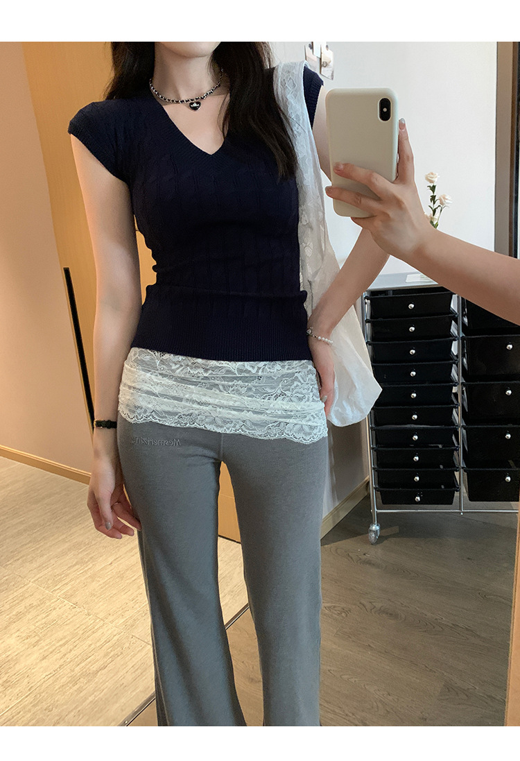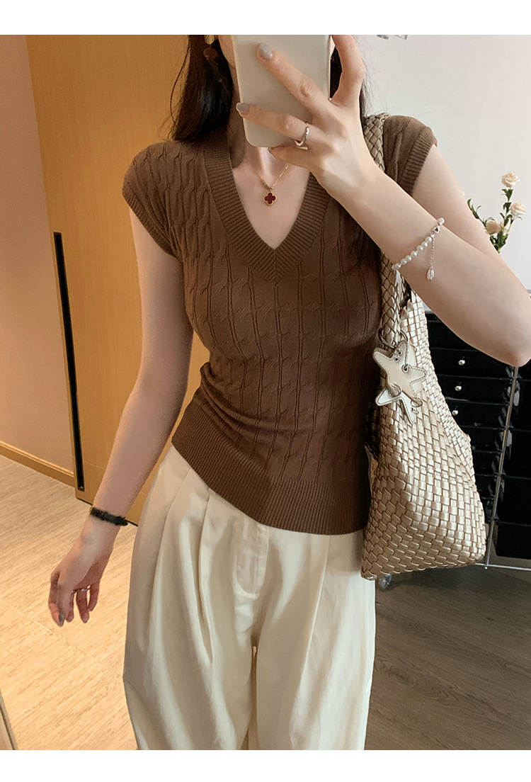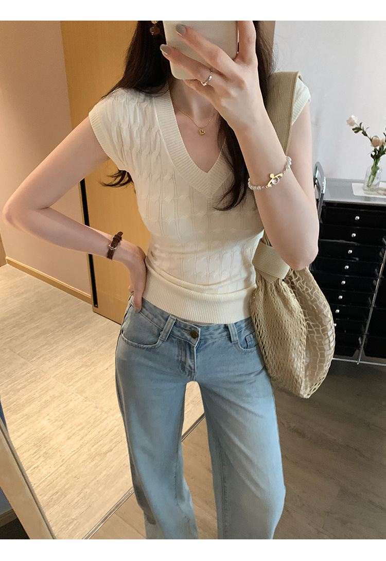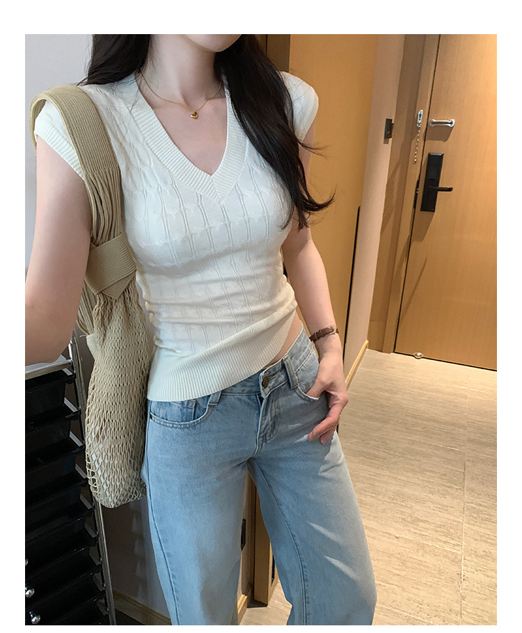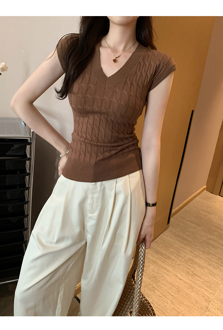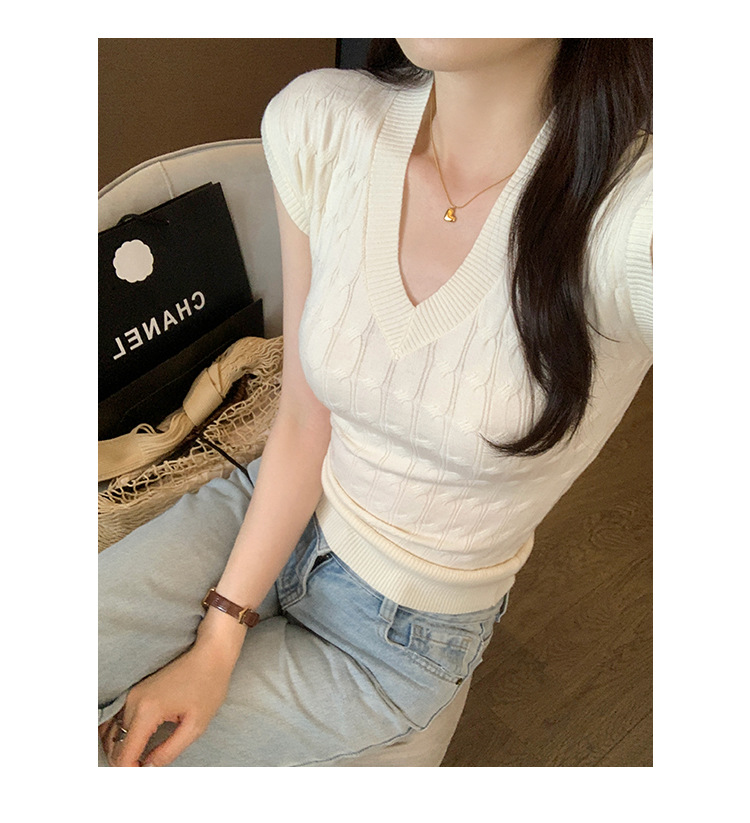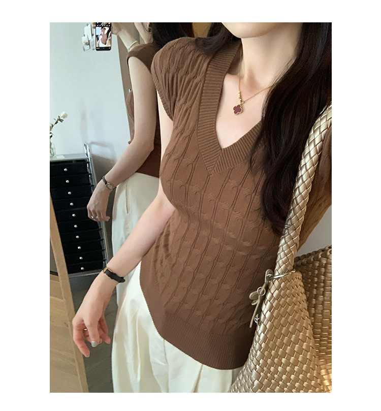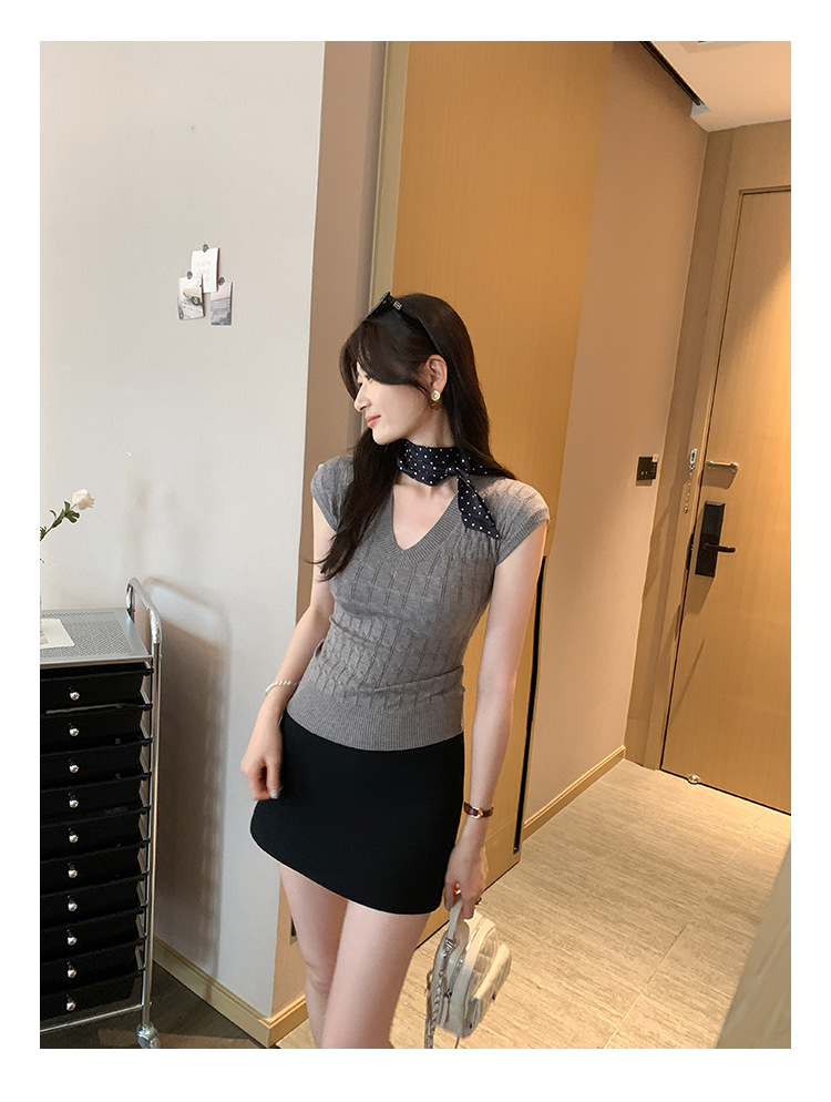 여성을위한 미국 복고풍 v 넥 니트 반팔 티셔츠 2025 여름 새로운 스타일 핫 소녀 연령 감소 슬림 스트레치 기질 탑